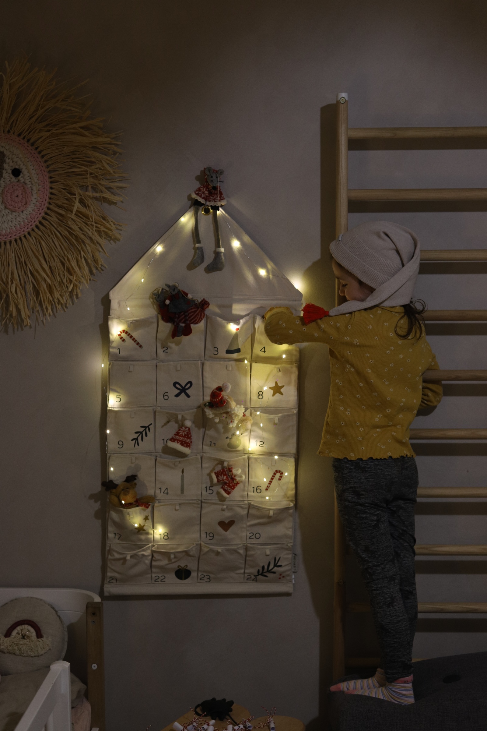 Napravljen je od 100 % organskog pamuka, što mu daje prirodan, topao i skandinavski karakter. Jednostavan i nježan, divno se uklapa u dom u kojem želimo toplinu i udobnost. Možete ga objesiti na zid ili vrata, ubaciti papiriće, slatkiše, poruke, male dekorativne božićne detalje. Kod nas su to najčešće uvijek bili neki zadaci, a ove godine sam se odlučila na čokoladice i bombone. Meni je predivan jer je od tkanine i svake ga godine možete promijeniti dodajući neke druge slate detalje, ukrasiti ga na malo drugačiji način i neće vam dosaditi. Osim što je praktičan, daje i dekorativnu vrijednost, neutralna bež “sandy” boja i dizajn koji podsjeća na kućicu čine ga decentnim, ali i toplim i blagdanskim elementom u interijeru.