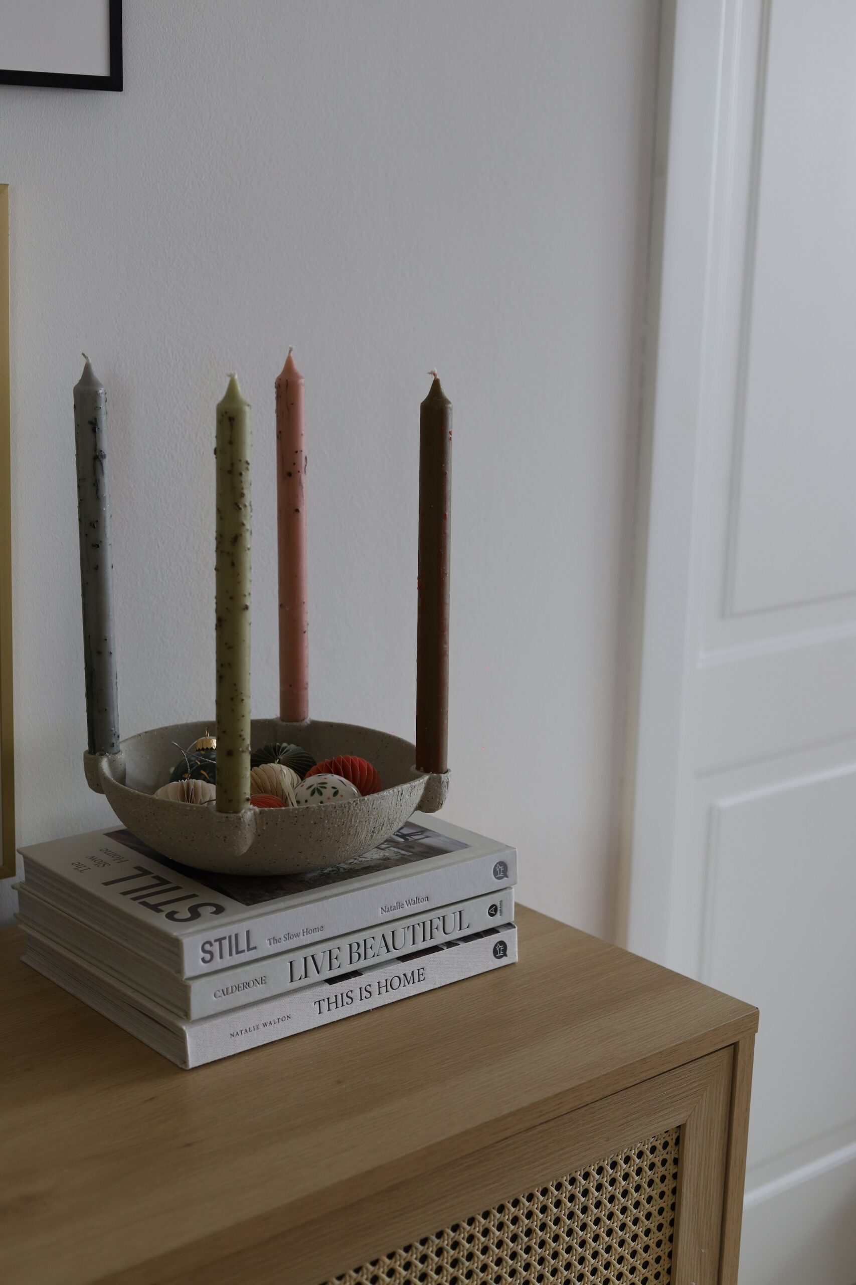 U sredini zdjele možete smjestiti sezonske ukrase poput grančice, kuglice, šipka ili nekih drugih malih detalja. Nekad će to biti češeri koje ste skupljali s klincima, ponekad suhe mandarine i pokoja grana bora, a ponekad božićne kuglice! Na vama je samo da kupite svake godine nove svijeće. Ono što mi se posebno sviđa je što svijećnjak odiše prirodnim, organskim stilom zahvaljujući neglaziranoj keramici sa zrnatom teksturom što daje toplinu i ugodnu “sirovost” u prostoru. I bez svijeća, svijećnjak sam po sebi ima minimalističku i skandinavsku eleganciju, lijep je za uređenje doma tijekom cijele godine, ali s posebnim šarmom zimi, kad poželite da prostor bude topao i domaći. Kod nas ćete ga naći i u vrijeme Uskrsa, kad zdjelu ispune grančice maslina i uskrsna jaja.