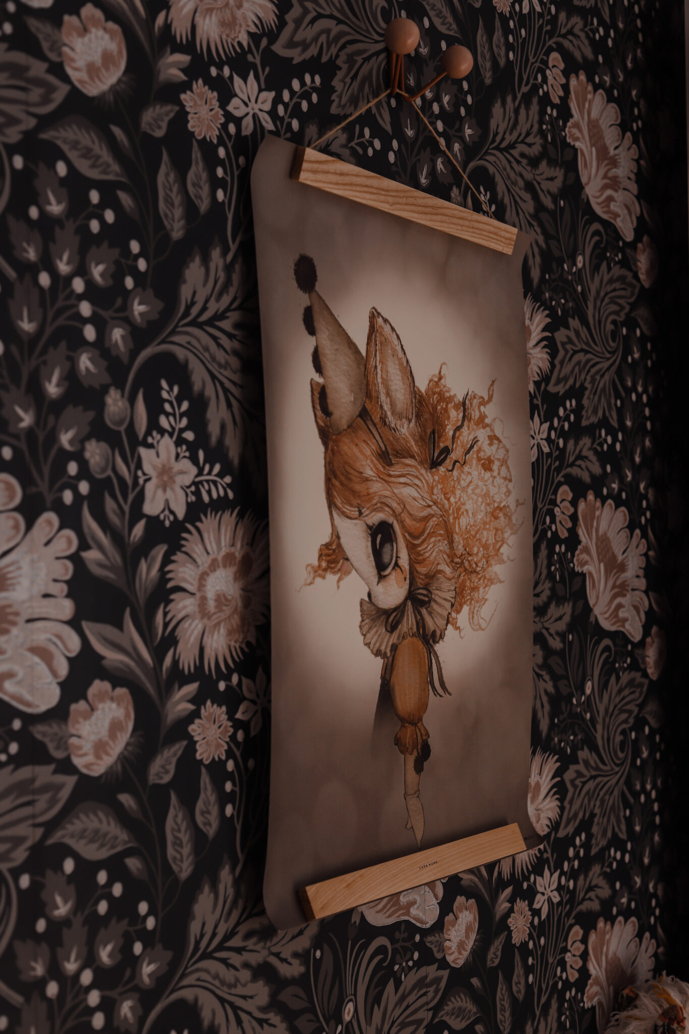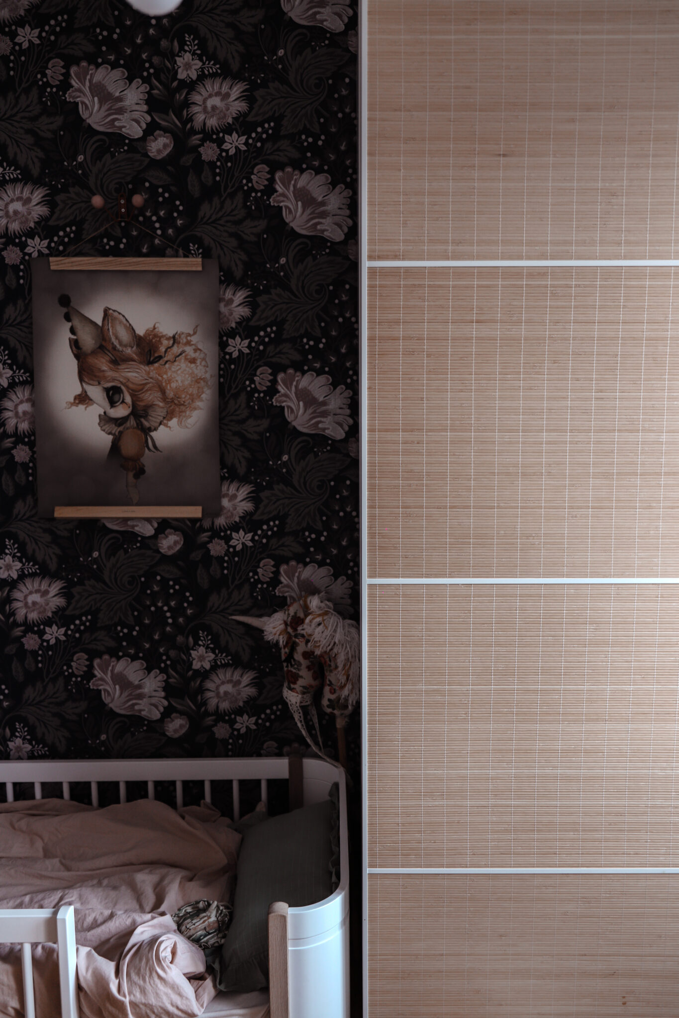 Na drugoj strani sobice uočit ćete još jednu predivnu cvjetnu tapetu, također brenda Sandberg. Baldahin je brenda Liewood i možete ga pronaći kod Mali zakladi. Plahte s uzorcima žireva naručila sam od HM home. Uz krevet na kat naći ćete prekrasnu Maileg drvenu kućicu i cijeli mali svijet mišića i zečeva prekrasnog brenda Maileg. Tu su i kocke od pluta, zgodne kutije za skladištenje koje sam pronašla u Jysk-u