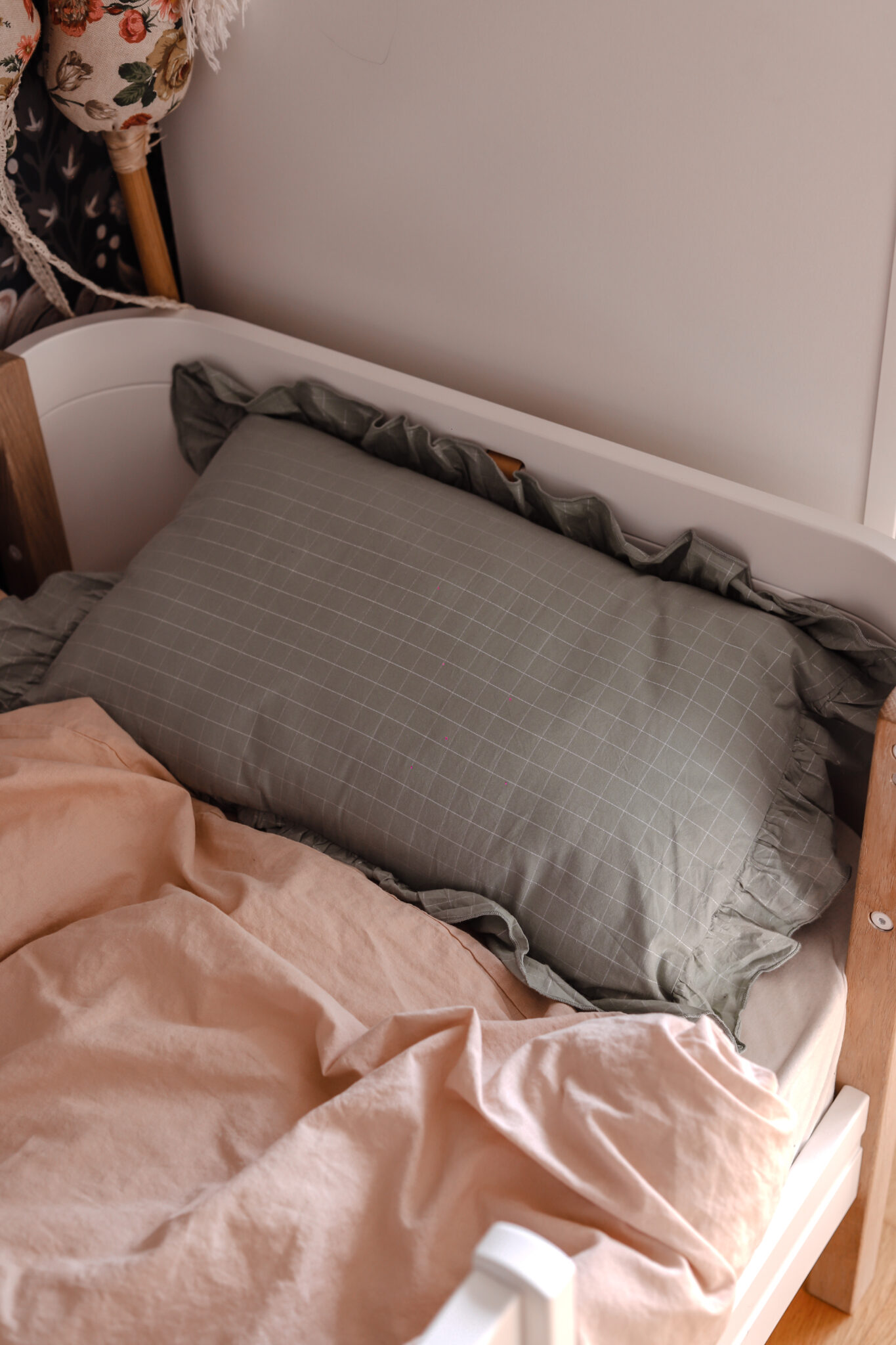 Posteljina je Ikea, a zelena jastučnica je Zara home. Pletena kolica su kupljena na sajmu u Sesvetama dok je šareni jednorog na štapu od već spomenute Nena Dolls.