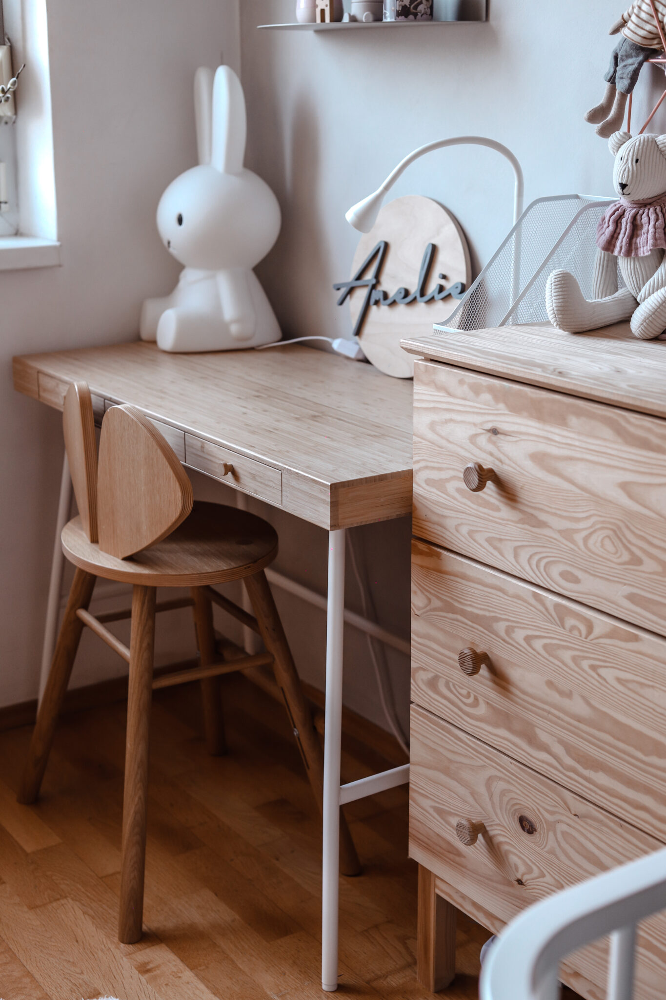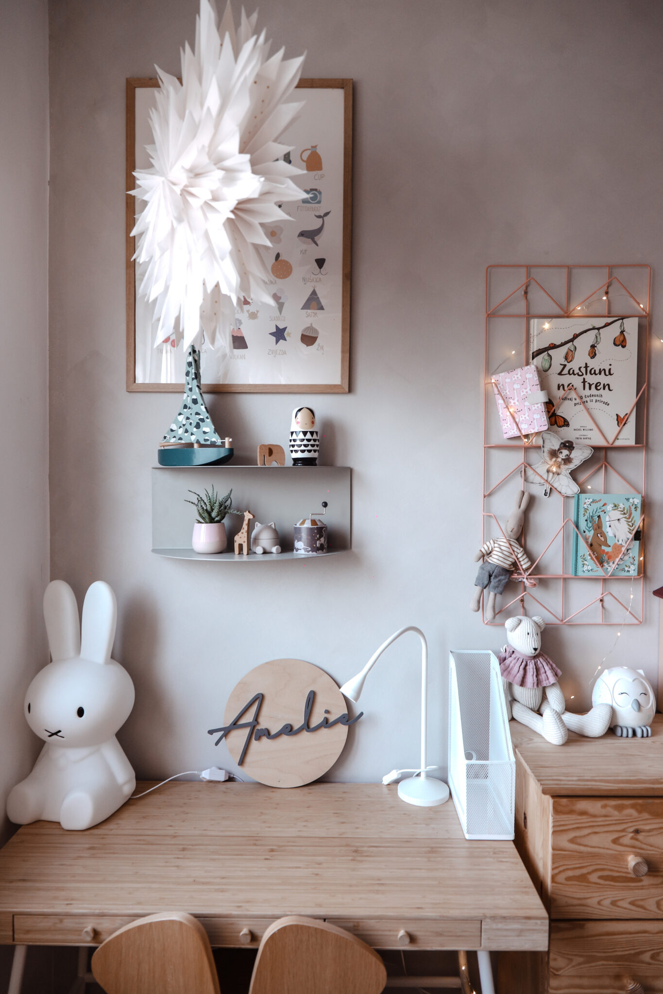 Neko vrijeme Lillasen radnog stola nije bilo in stock pa smo u Ikei ostavili broj mobitela kako bi nas obavijestili sms-om kad stol opet bude dostupan. Od bambusa, udoban, divnog i jednostavnog dizajna, ne zauzima nam puno prostora u našoj maloj sobici, a opet ima dovoljnu radnu površinu. Na njega smo postavili Liewood podlogu čija je prednost ta što je velika tako da fino zaštiti cijeli stol i bez brige sam kad se Mila dočepa flomastera. Iznad stola zid krasi oglasna ploča roze boje od čelika ne koju Amelie može staviti što poželi kako bi razbili sivu boju. Tu je i nova siva polica koju sam kupila u Jysku. Jako mi se dopala jer je jednostavna i taman nam je stalo nekoliko ukrasa i detalja poput kaktusa o kojem A. vodi brigu. Poster Abeceda jedan mi je od dražih detalja u njenom radnom kutku, kao i viseća papirnata zvijezda koju imamo već preko godinu dana. Lagana je i objesili smo je uz pomoć flaksa tako da izgleda kao da lebdi, a i cijelo vrijeme se lagano okreće. Baš je posebna! Zvijezda je brenda Wattveke i bila mi je dugo na wish listi.