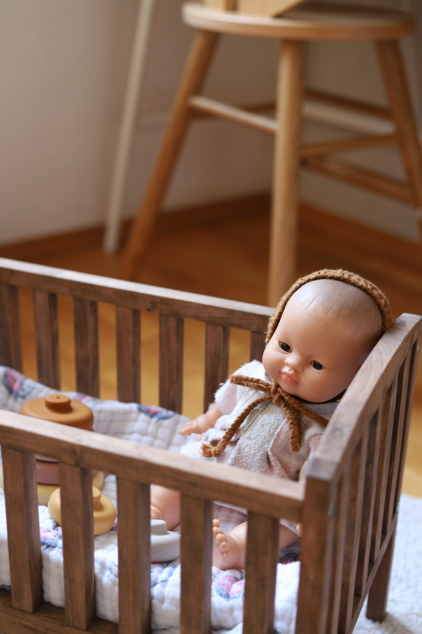 Mila je za svoj prošli roćkas dobila preslatku lutkicu azijatkinji i drveni vintage krevetić i to domaćeg brenda Pinch toys.