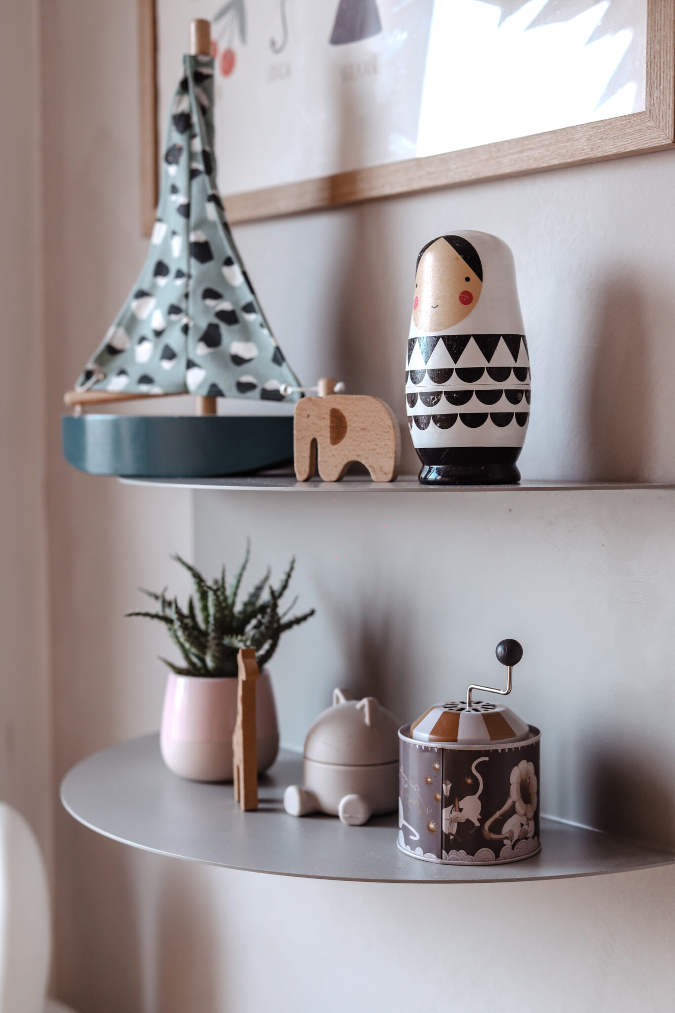 U ormaru imamo i jedan dio igračaka i to najviše puzzle, knjige i slagalice. Kako je sobica malena, igračke imaju nekoliko lokacija; ispod kreveta, veliki Pax ormar i komoda koja nam se nalazi pored radnog stola. Na divnim Sandberg tapetama nalazi se jedna jednostavna drven vješalica koja je jedno vrijeme bila baš popularna na Instagramu. Vješalica je brenda HM home. Nama još uvijek nije dosadila, a na njoj ćete trenutno naći nekoliko prekrasnih detalja poput pletene košare brenda Olliella koju smo pronašli kod @mojamalasobica. U košari se nalaze prekrasne ručno rađene lutke domaćeg brenda Mala igra.