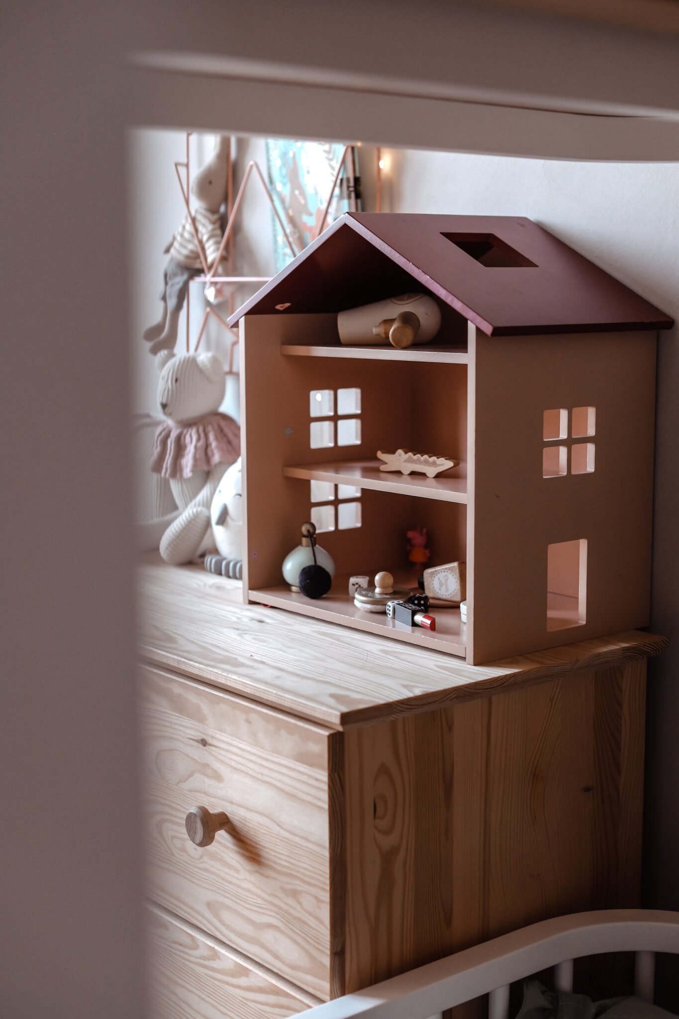 Do radnog stola nalazi se drvena komoda koju smo kupili u Ikei. Na njoj se nalazi ovisno o tome što je curama trenutno aktualno od igračaka. Obično su to neke drvene igračkice, kockice, puzzle, plišanci… Naći ćete i prekrasnu Nofred kućicu u kombinacijama roze i bordo boje. Možete je pronaći kod @malizakladi. U kućici se nalazi set za šminkanje od drveta od brenda Le toy van, a možete ga naći kod @atelier_bebes.