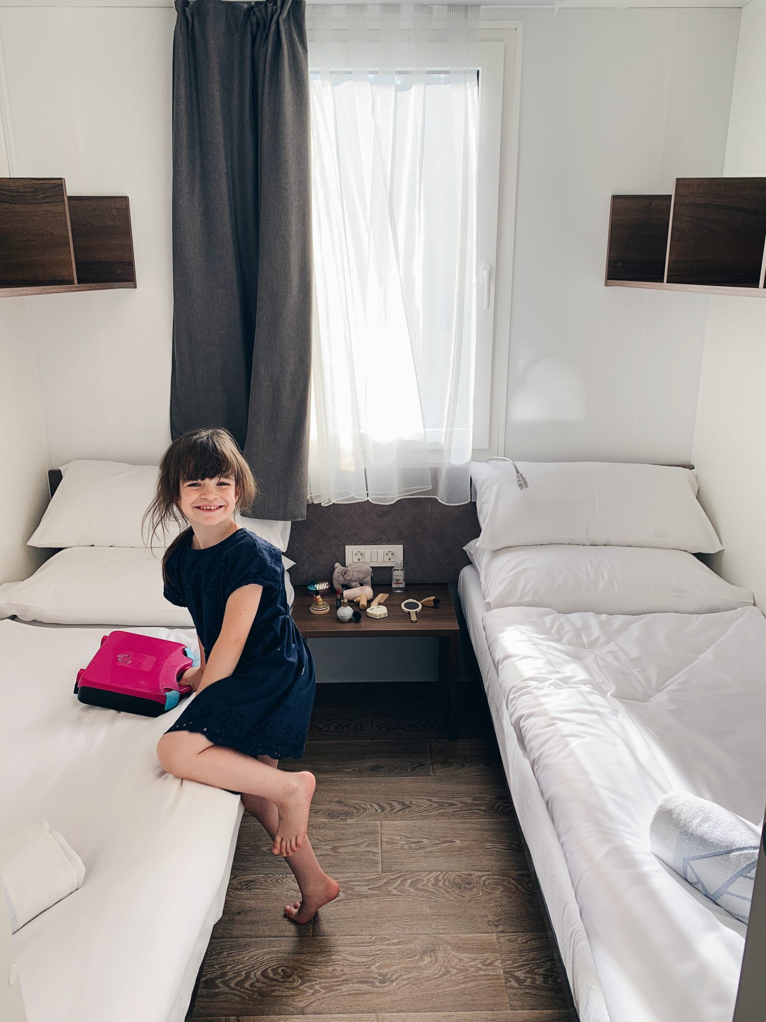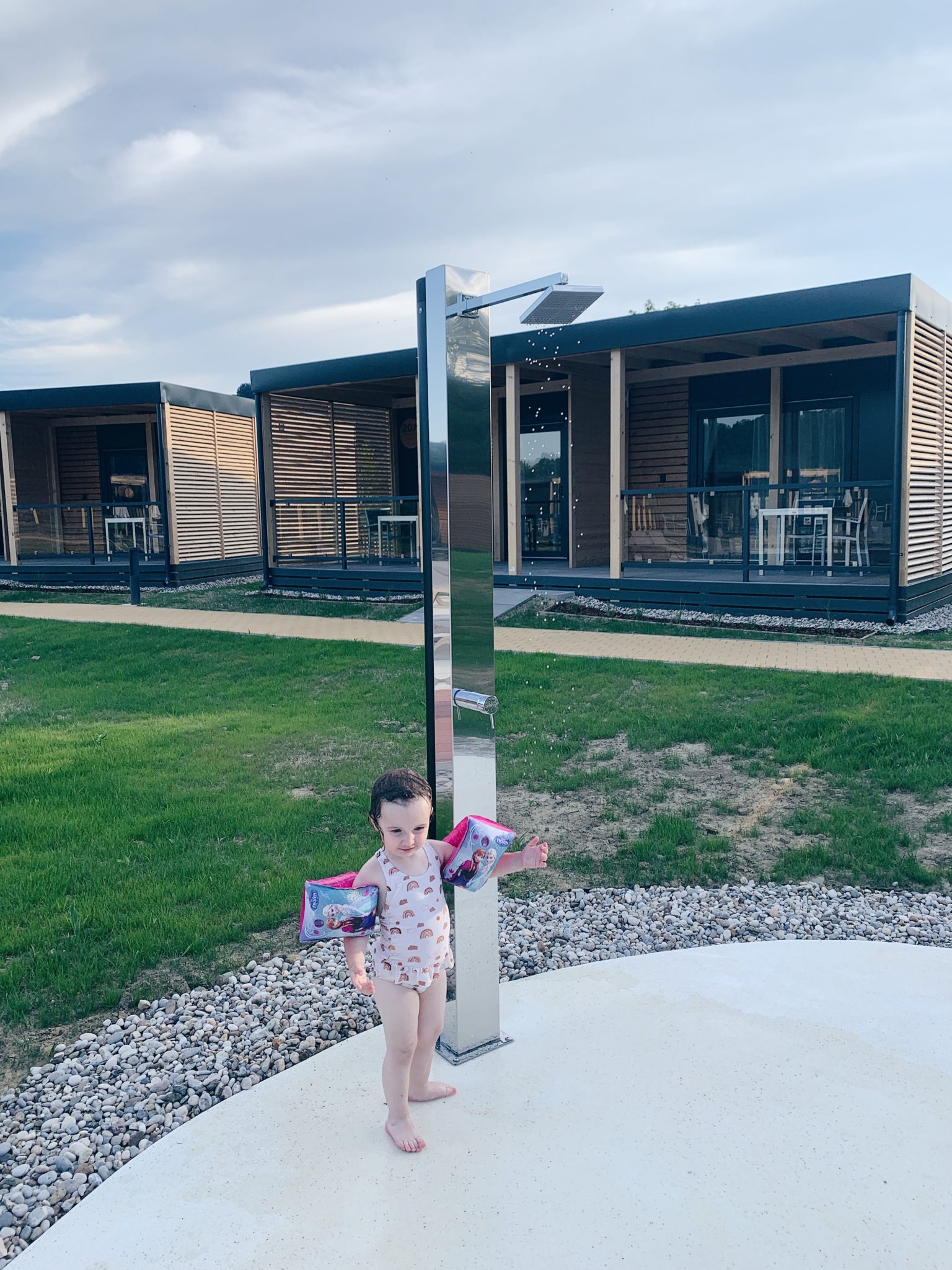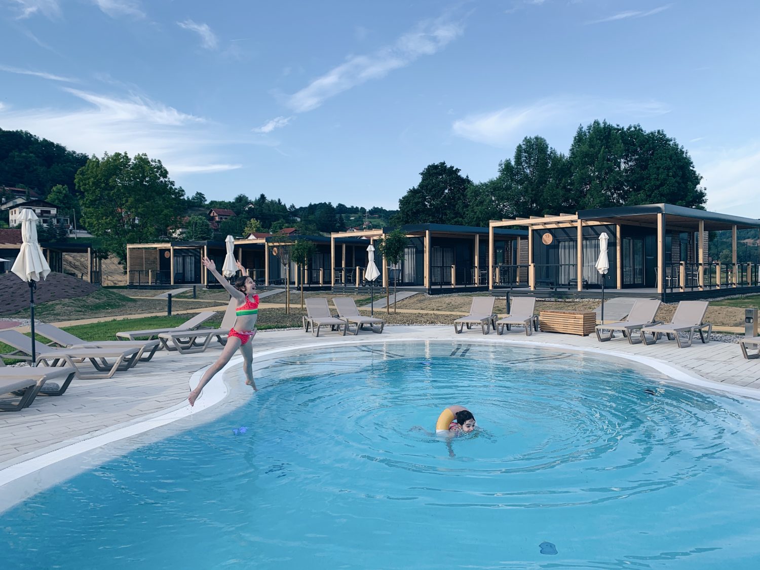 Znate koliko volim lijepe interijere, i ono što me posebno impresioniralo, su moderne drvene kućice s velikim terasama gdje se čuje šum vode i uživa u idiličnom pogledu na zelene zagorske brege. Odmah nakon dolaska smjestili smo se u našu luksuznu kućicu s dvije spavaće sobe, dnevnim boravkom s velikim kaučom na razvlačenjem, potpuno opremljenom kuhinjom, kupaonicom, wc, dvije klime, dva televizora… ma sve i više nego što jednoj obitelji treba na odmoru. Kućica je modernog stila, svijetle sobe uz panoramske prozore, panoramska staklena vrata na drvenoj terasi koja mami na uživanje. Gledali smo da naša kućica ima odličnu poziciju gdje nam je wellnes bazen s jedne strane, a dječji bazen s druge strane. Prvo što me je Amelie pitala nakon nekoliko minuta provedenih u glamping kućici bilo je “Mama možemo mi tu živjeti?” Pokraj naše kućice bio je prostor za roštilj; otvoreno ložište gdje možete na večer provoditi zabavne sate s klincima; savršeni prostor za druženje ako ste došli s ekipom na odmor ili ako želite upoznati fora obitelj iz Austrije koja baš grila lignje, kao što je bio slučaj kod nas.