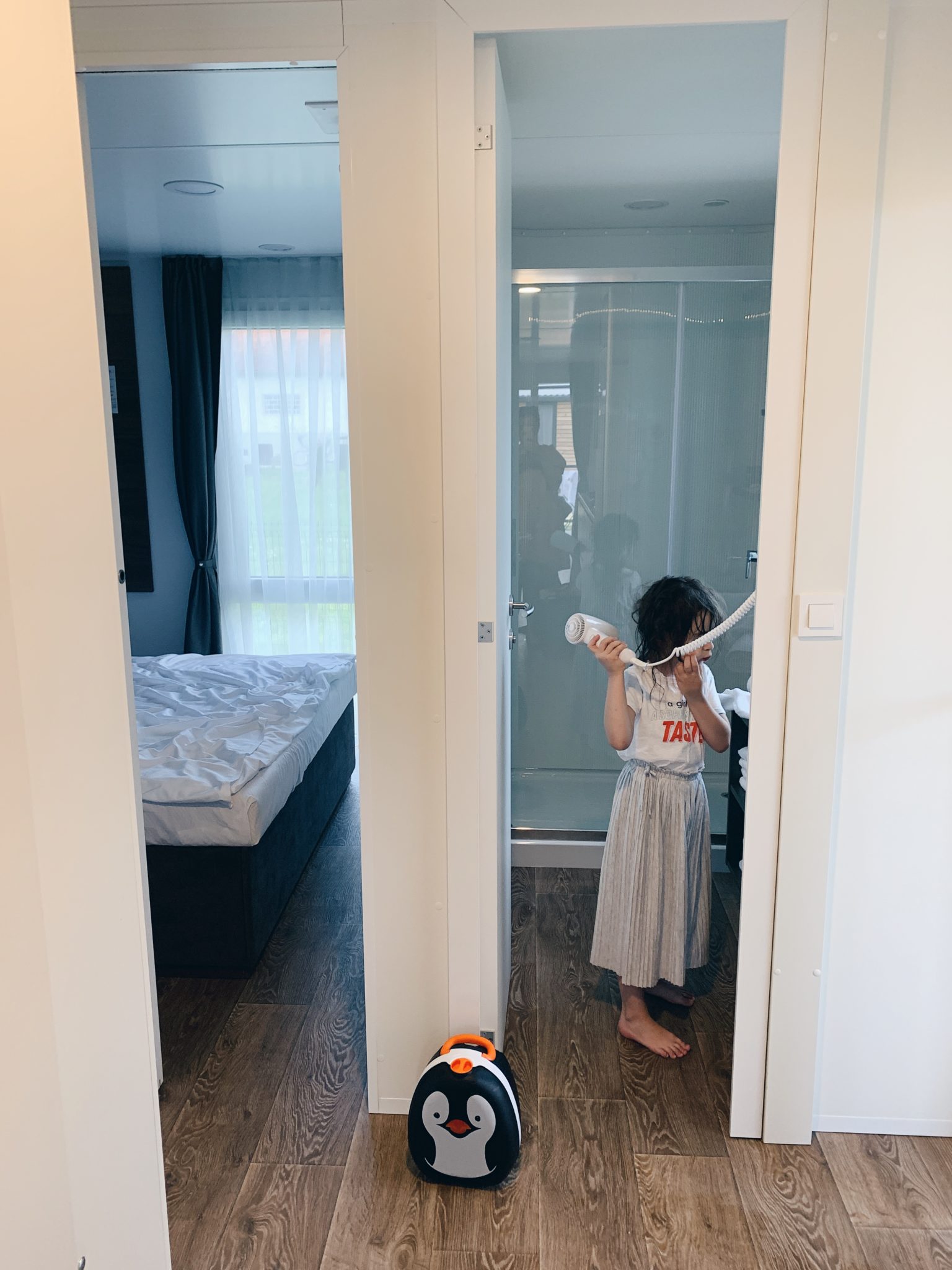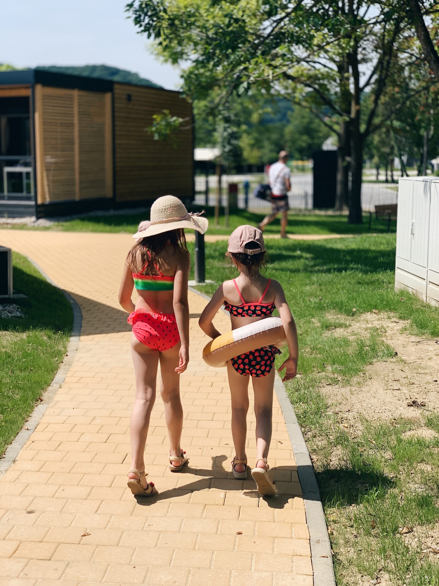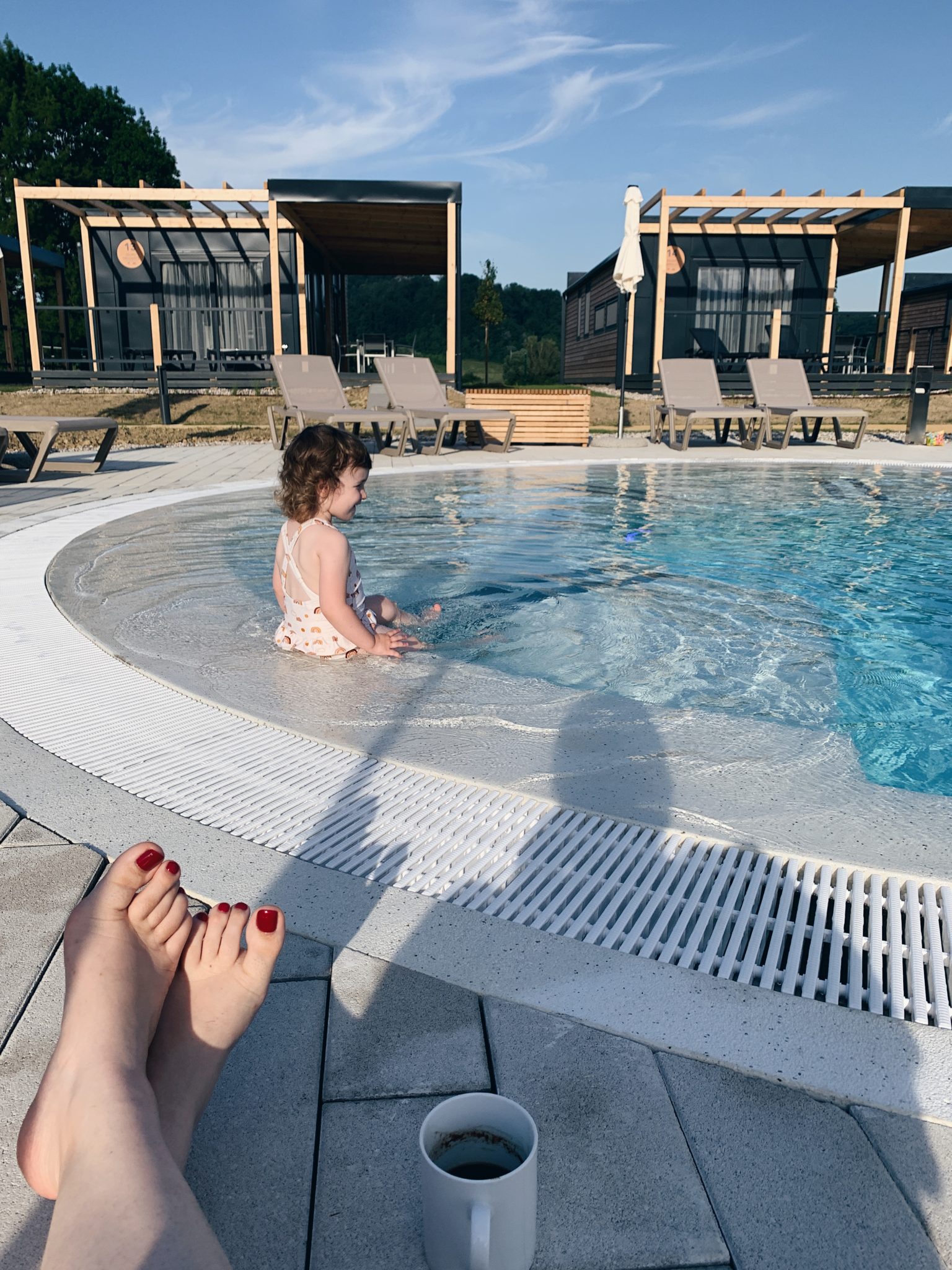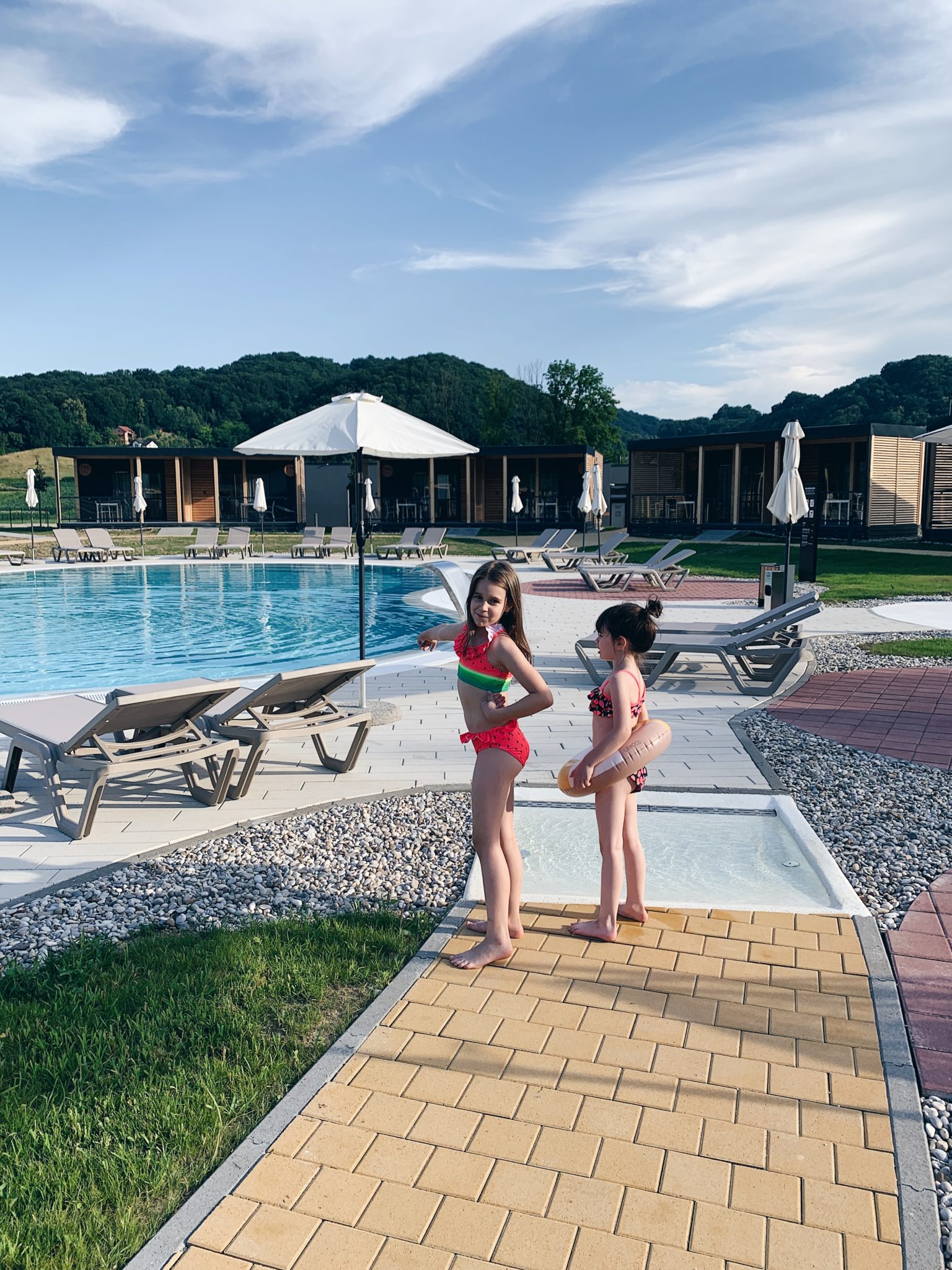 Nakon što smo se brzo raspremili i aklimatizirali za vikend uživanja, curke su se odmah prebacile u kupaće kostime i maksimalno iskoristile oba bazena u Glamping Villageu, brčkajući se čas u jednom, čas drugom. Zabava je dugo trajalo, što nas je naravno napravilo gladnima, pa smo skoknuli u restorana Lati od hotela Well, koji je na 2-3 minute od naše kućice. Nakon odlične večere, prošetali smo se oko hotela i našeg glampinga, a cure su odmah našle dječji park, gdje smo isprobali sve ljuljačke, klackalice i tobogane prije nego smo se vratili u našu kućicu. Naravno da su opet htjele u bazene, ali nekako smo ih uvjerili da ipak bolje otići spavati 🙂 Ivan i ja smo ostali malo duže budni, uz koju čašu vina na ležaljkama terase.