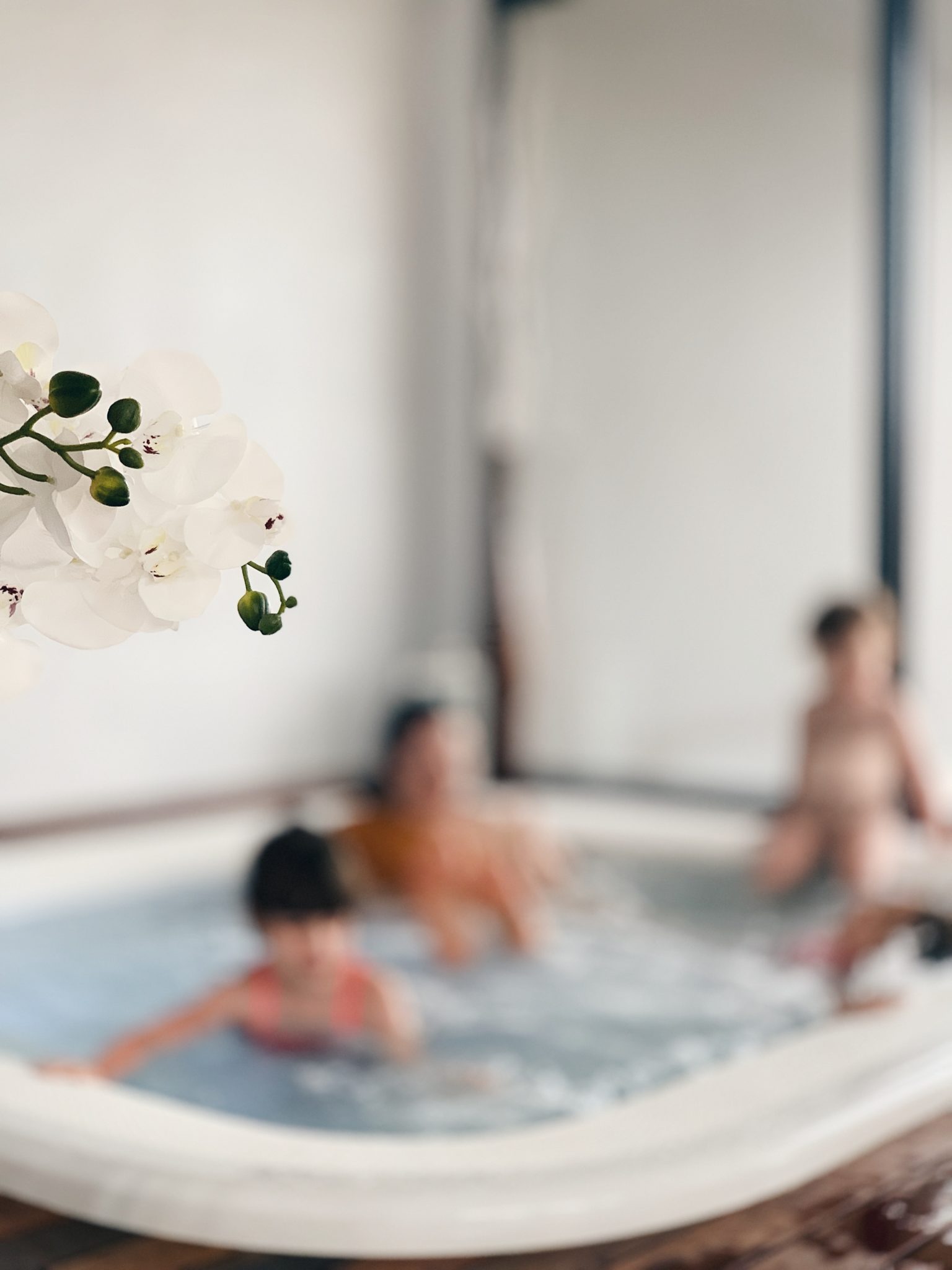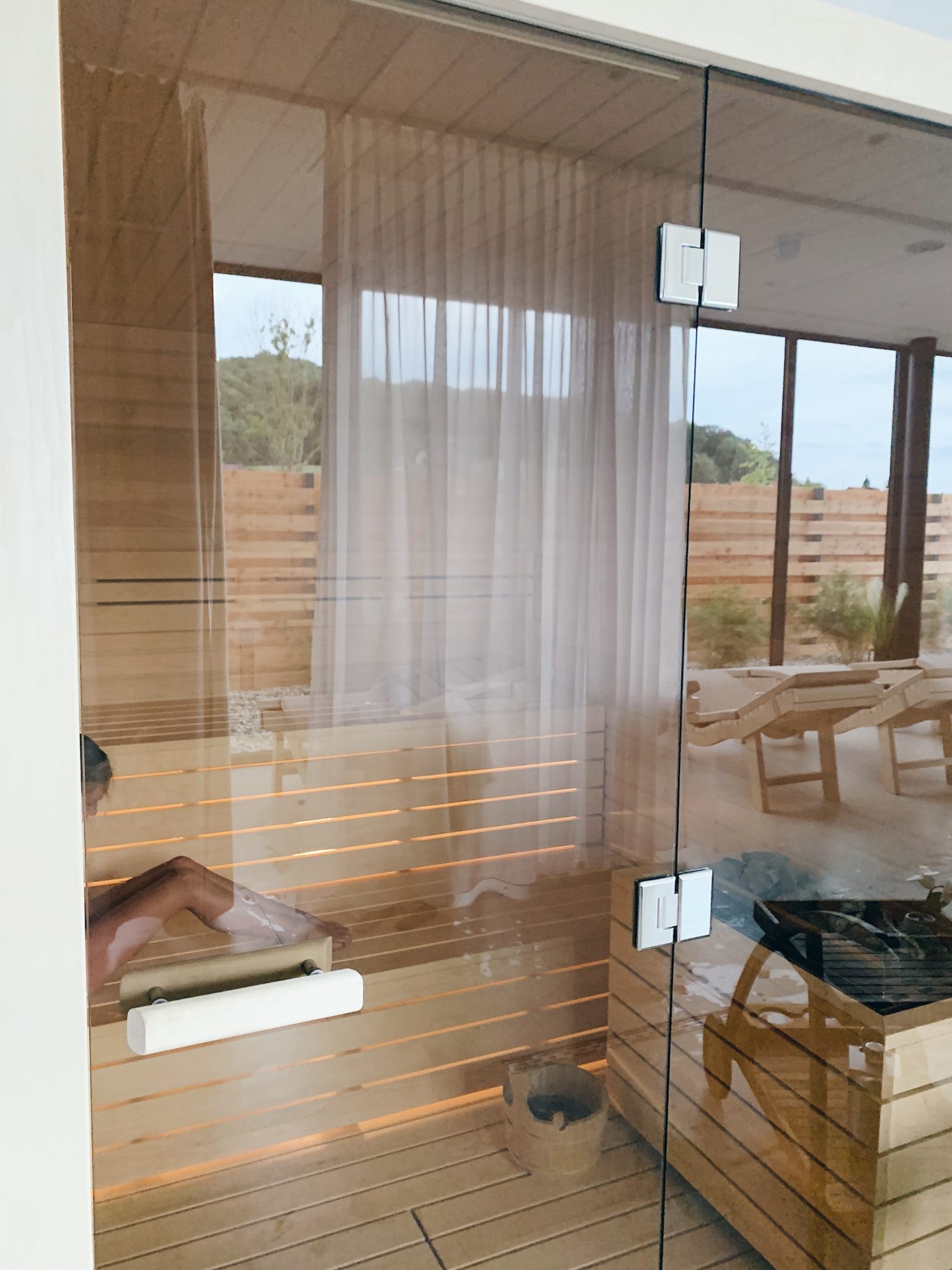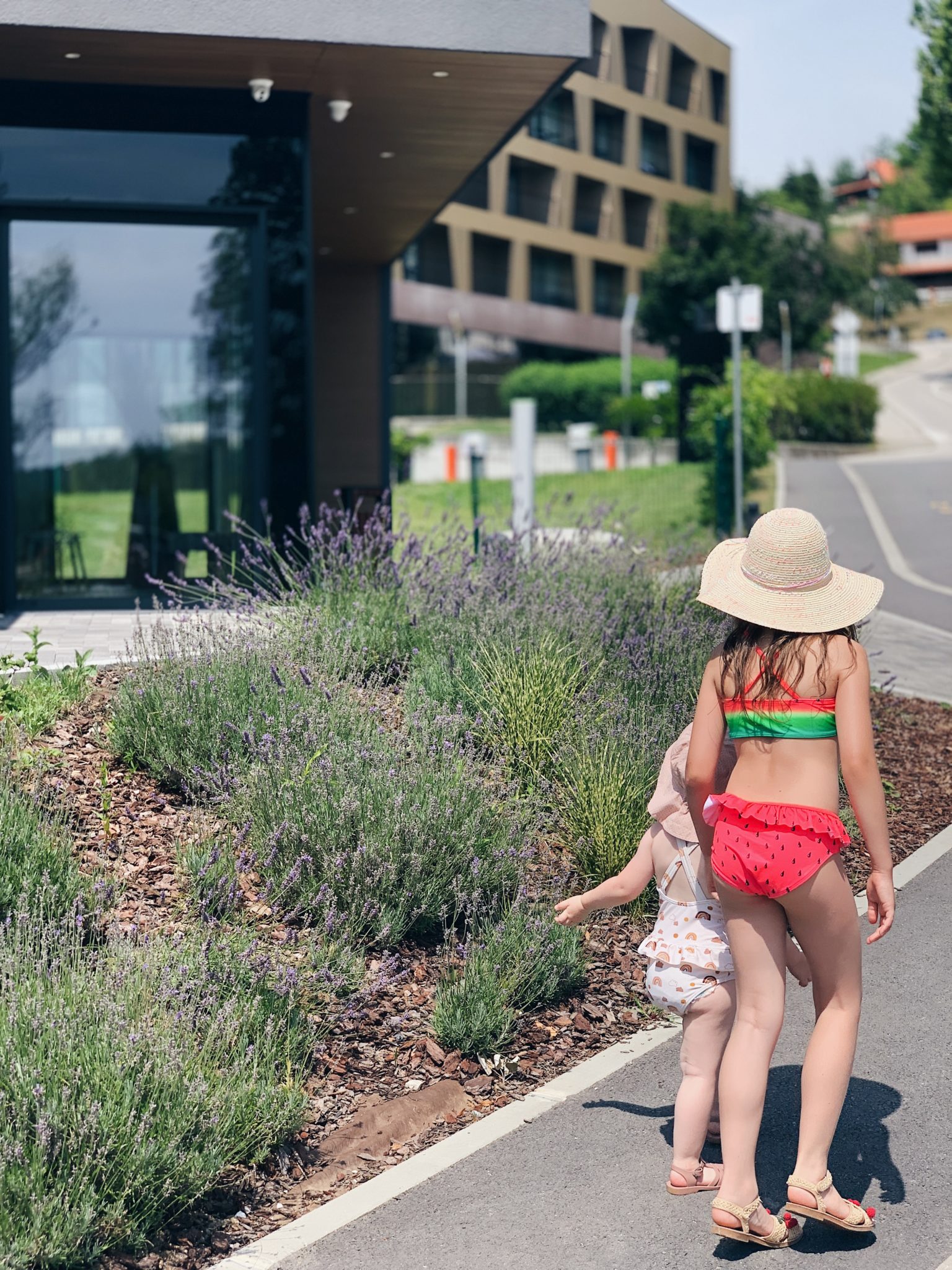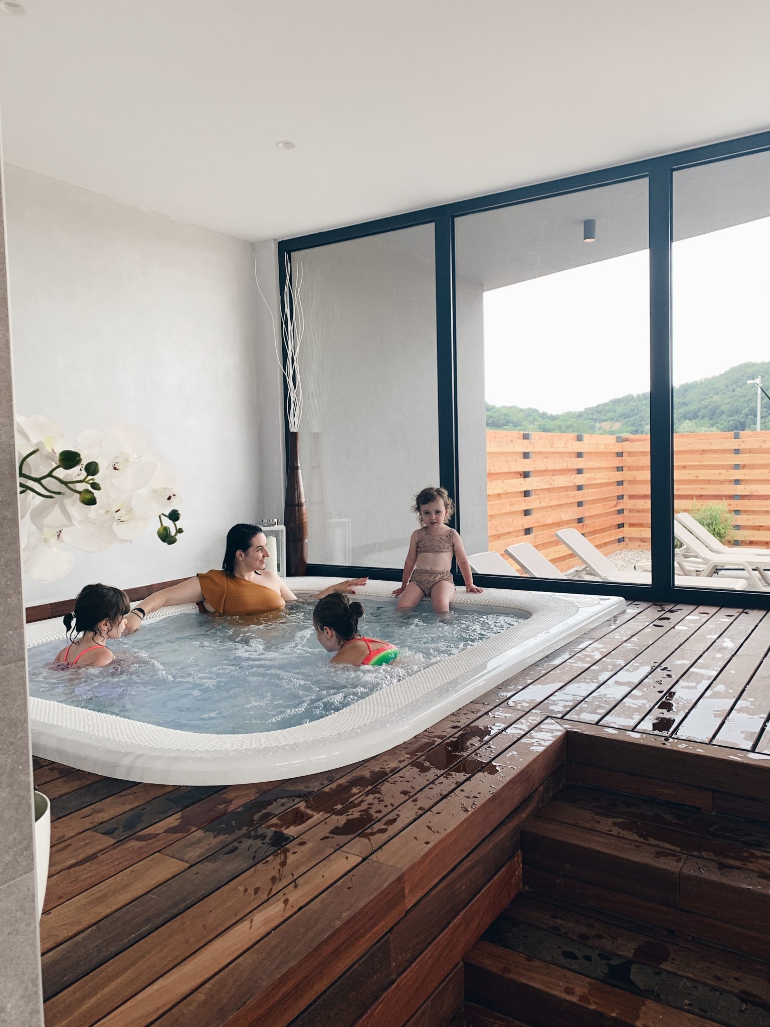 Nakon doručka bilo je vrijeme za ozbiljnu zabavu. Odlično je to što se bukiranjem smještaja u glampingu dobije i neograničeno kupanje u Vodenom planetu, te smo se tamo i uputili. Curke su bile naravno oduševljene raznim vanjskim i unutarnjim bazenima, vodenim atrakcijama, toboganima, valovima… Nakon ručka i kupanca, Mila je odradila popodnevni spavanac, dok sam ja uživala u masaži u hotelu Well. Počela se spremati kiša pa smo odlučili svratiti u saunu koja vam je na raspolaganju unutar samog glamping sela. Znači predivno! Minimalizam i toplina samog dizajna su me osvojila! Tu se nalazi i jacuzzi okružen velikim staklenim površinama kroz koje smo gledali lijepo bilje kako se njiše udarom vjetra i kiše. Zamišljala sam kakav je pogled zimi, kad pada snijeg, a vi uživate u jacuzziju ili sauni. Tik do jacuzzija nalazi se i sunčalište ako imate želju imati svoj mir i želite se maknuti od bazena i djece. Amelie i ja smo uživale u sauni, dok je Ivan krenuo s curkama do kućice. Bio je dogovor da idemo pojesti nešto slatko. Curke će palačinke, a ja sam maštala o gin tonicu. I gdje smo to našli? U dvorcu Mihanović gdje se nalazi i sam restoran istog imena. Koliko daleko? Doslovno između hotela i glamping sela. Jeli smo prefinu panacotu, pričali strašne priče o vitezovima iz dvorca i uživali s našim curkama. Moram priznati da iako su bile umorne od bazena i aktivnosti, nije bilo kaosa u restoranu. Imala sam osjećaj roditeljskog ponosa što imam tako divnu djecu.
