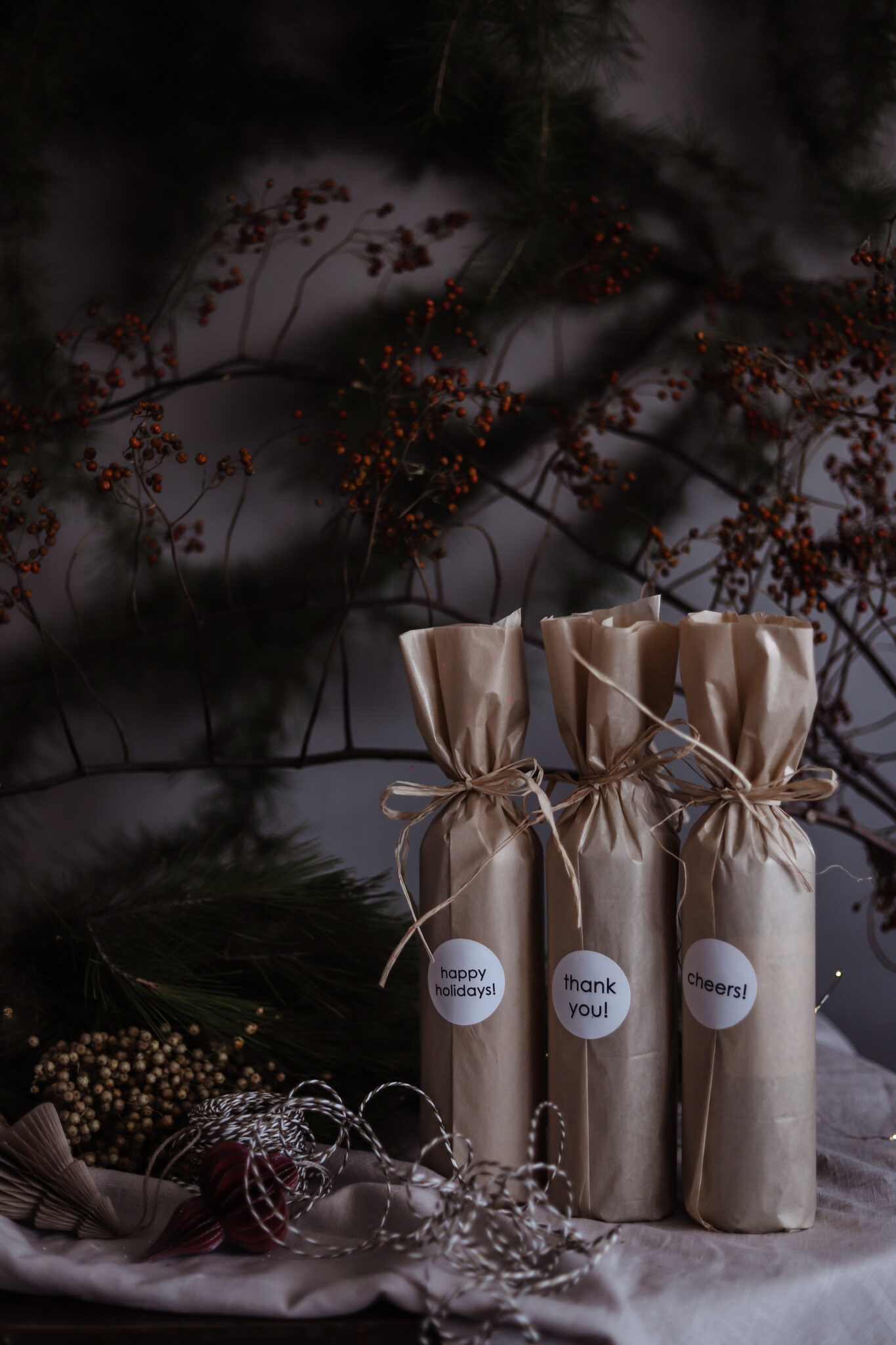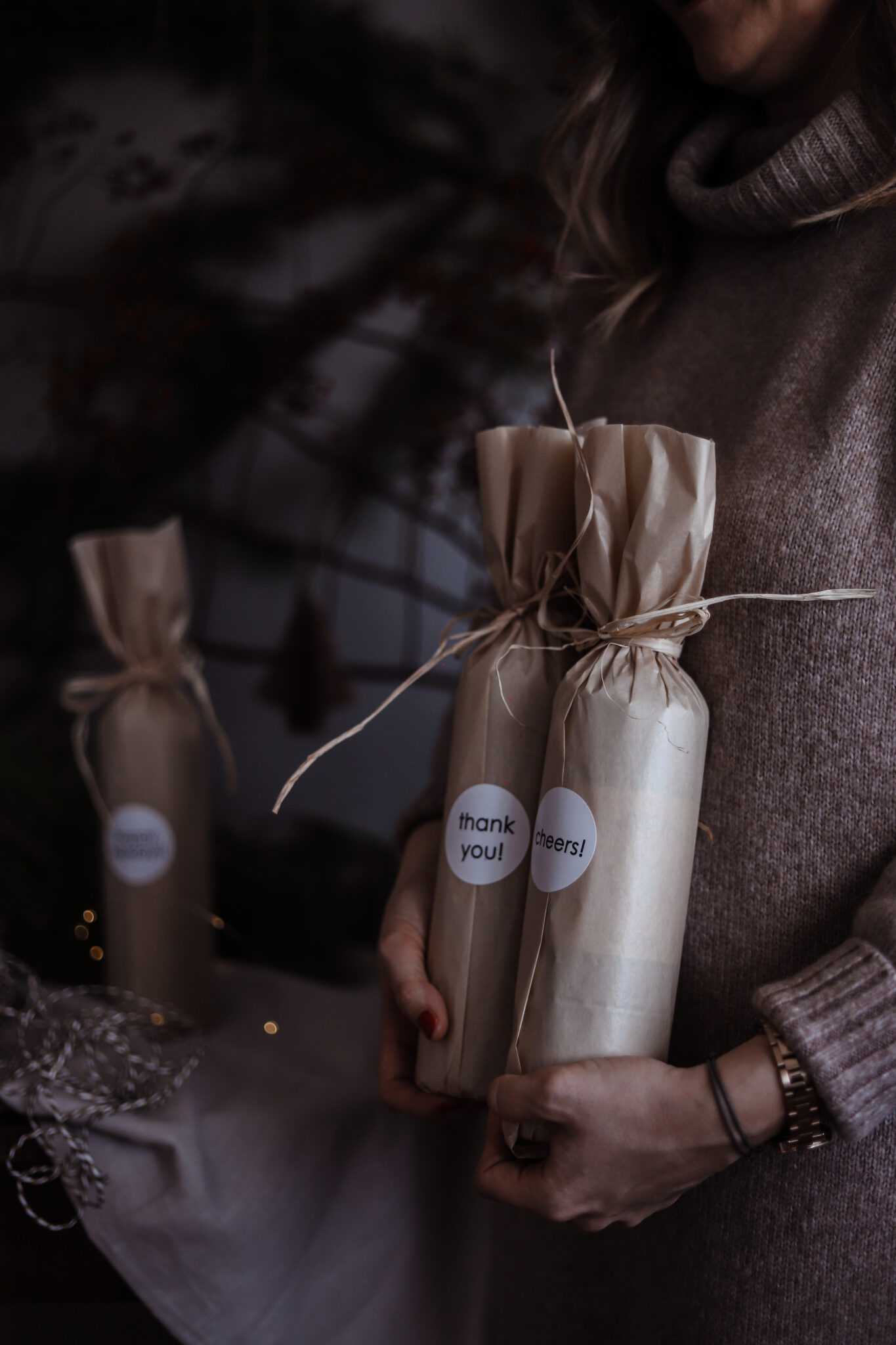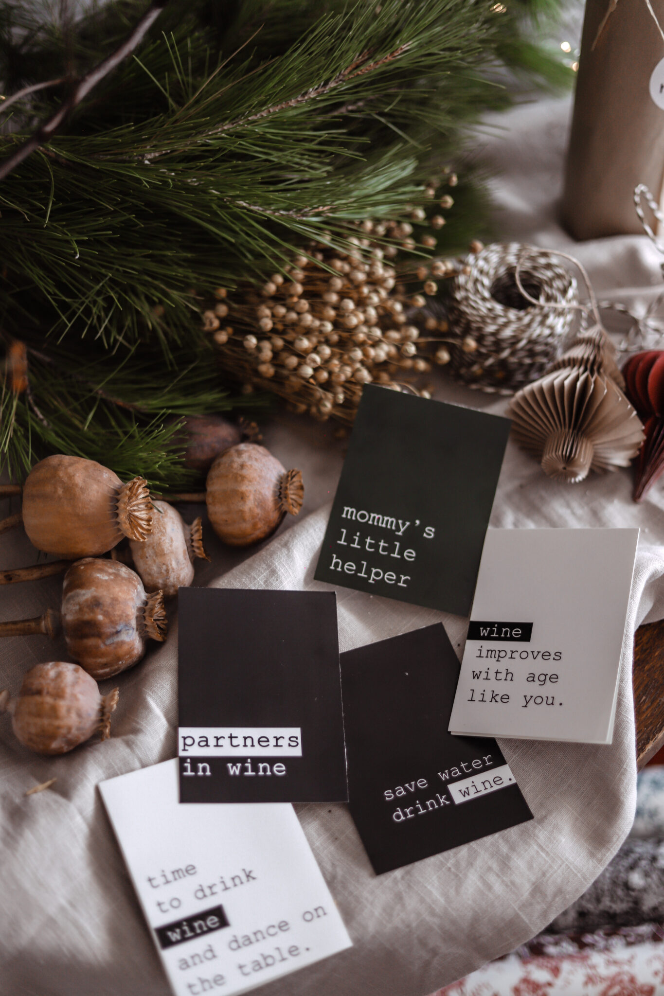 Ima tome sad već par godina… znaš da se meni stalno vrte neke ideje po glavi pa eto etikete su nešto gdje sam spojila suprugov posao i moj hobi. Prvo mi je pala na pamet ideje za etikete Mommy’s little helper, jer svi znamo koliko mame imaju posla oko priprema za blagdane, a onda sam shvatila da moram imati nešto i za ljude koji nisu roditelji. Etikete su uvijek dostupne i ljudi ih kupuju cijele godine, ali za Božić uvijek dodam nešto novo. Ove godine je to novi papir za zamatanje i poruke kojima ga lijepim. Ovisno što želite poručiti osobi kojoj poklanjate vino izaberete naljepnicu, Thank you, Cheers ili Happy holidays.
