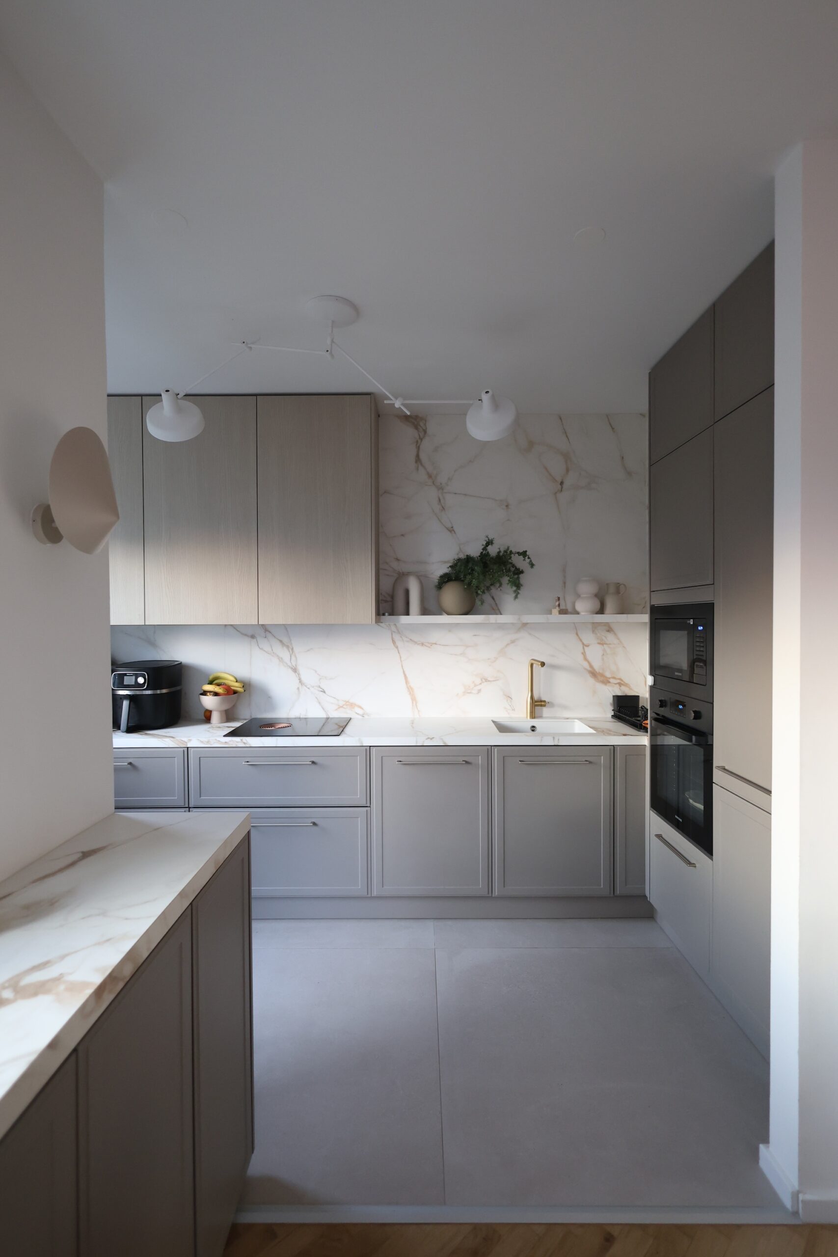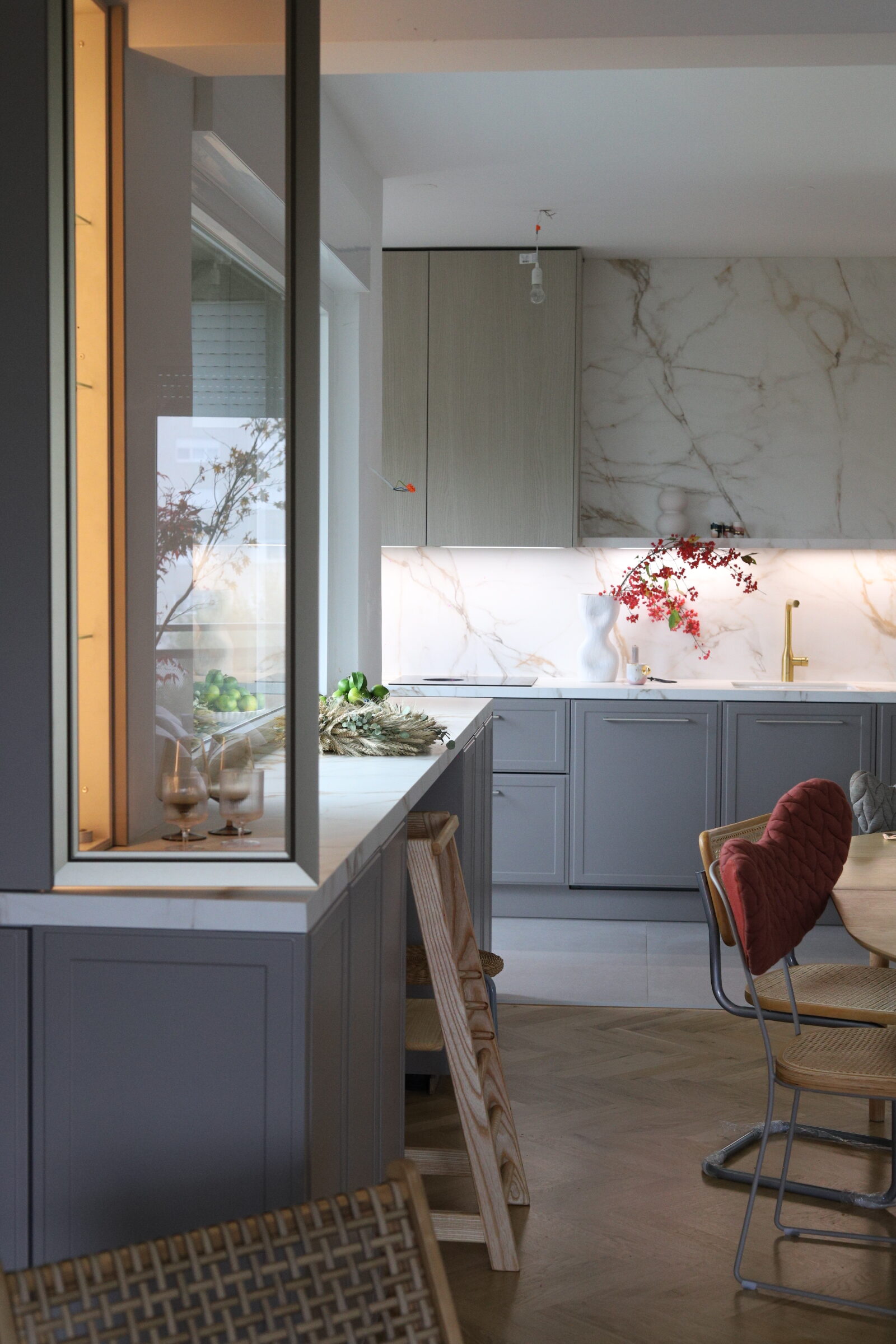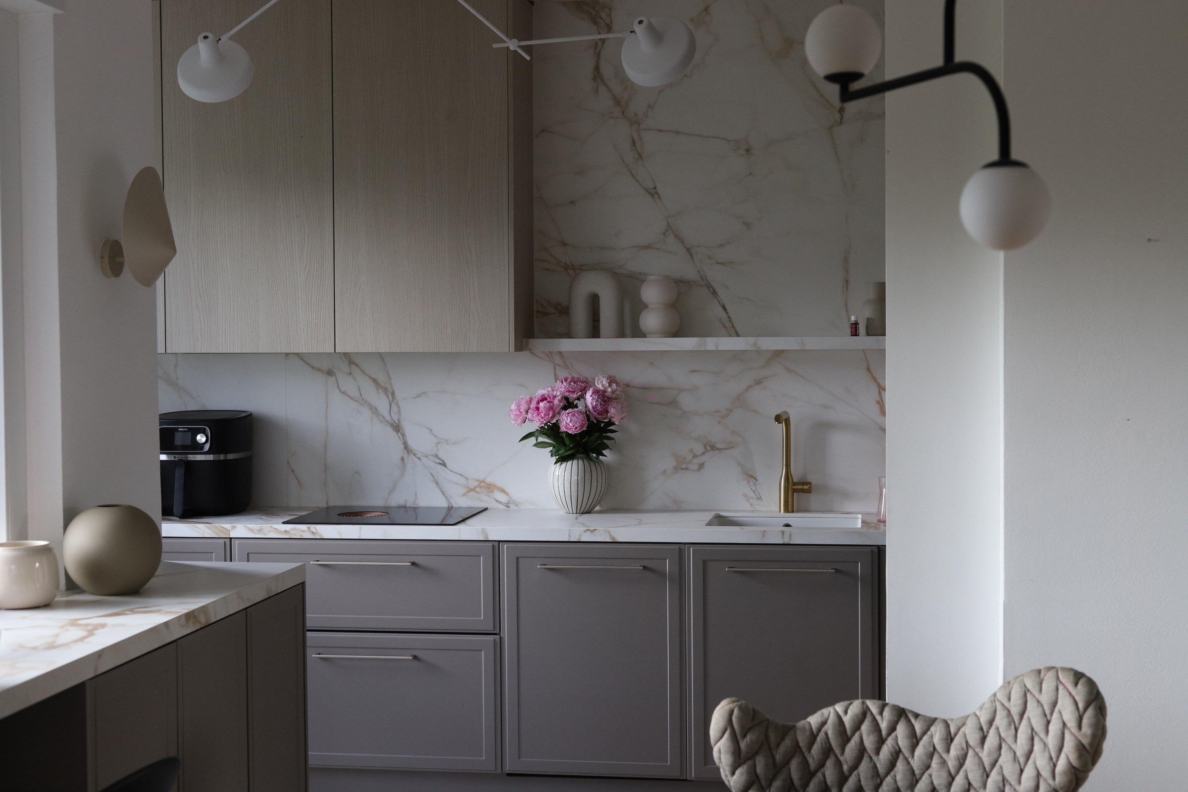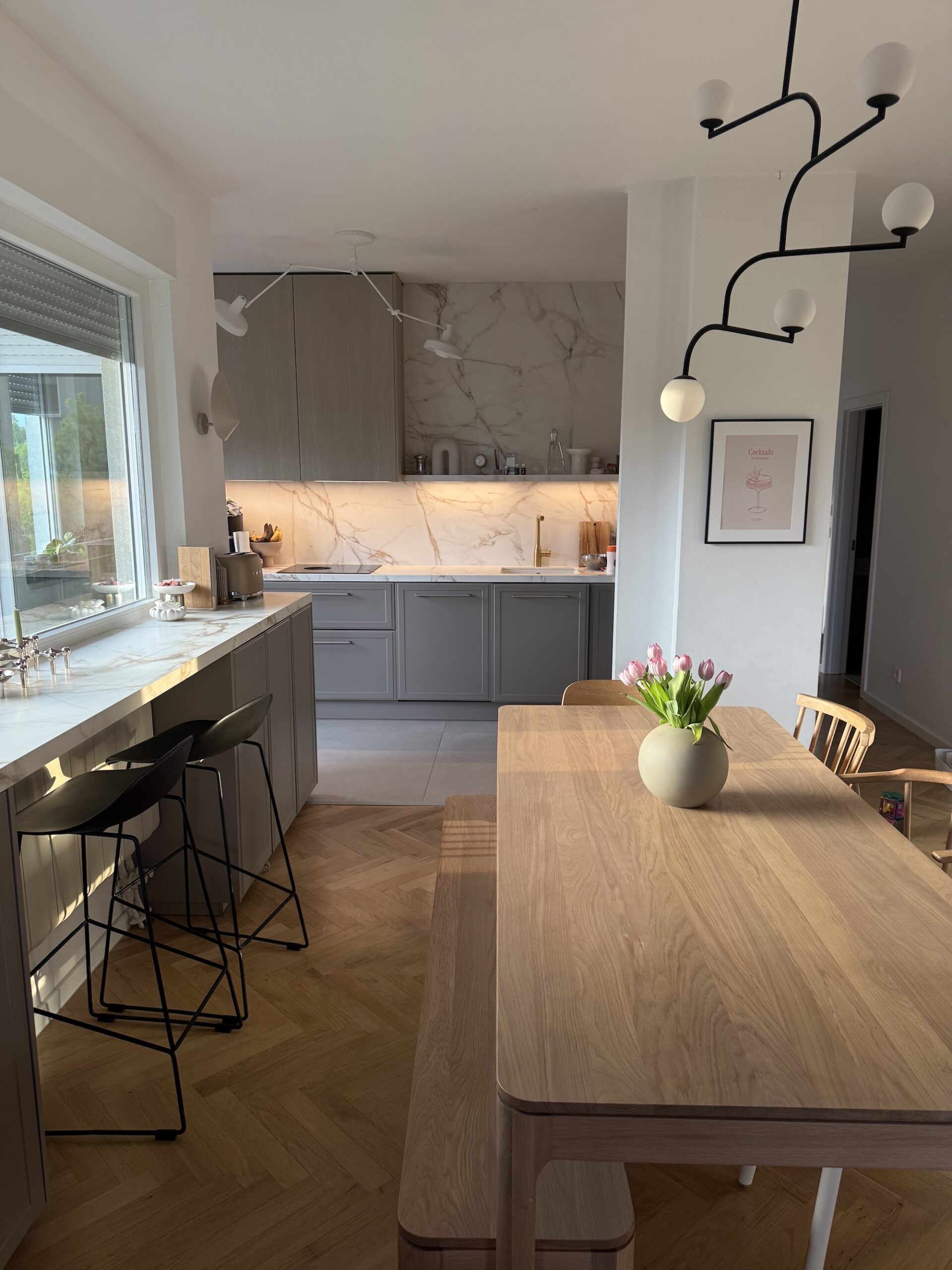 Svi koji me pratite već neko vrijeme znate da mi je prva inspiracija za kuhinju bila Athena Calderone ( kao valjda i svakoj osobi koja ima svoje Pinterest albume), zbog koje sam se zaljubila u marble uzorak i od prvog dana renovacije znala sam da će to biti nit vodilja za moj moodboard nove kuhinje. Čak sam jedno vrijeme i razmišljala o toj njenoj famoznoj plavoj kuhinji u New Yorškom stanu kao boju koju sam mogla zamisliti u svom domu. Ali samo na kratko vrijeme. Nije me to dugo držalo. Nakon plave prešla sam na japandi stil, i tamniju nijansu drva, da bi se na kraju odlučila za spoj skandinavskog i klasike.