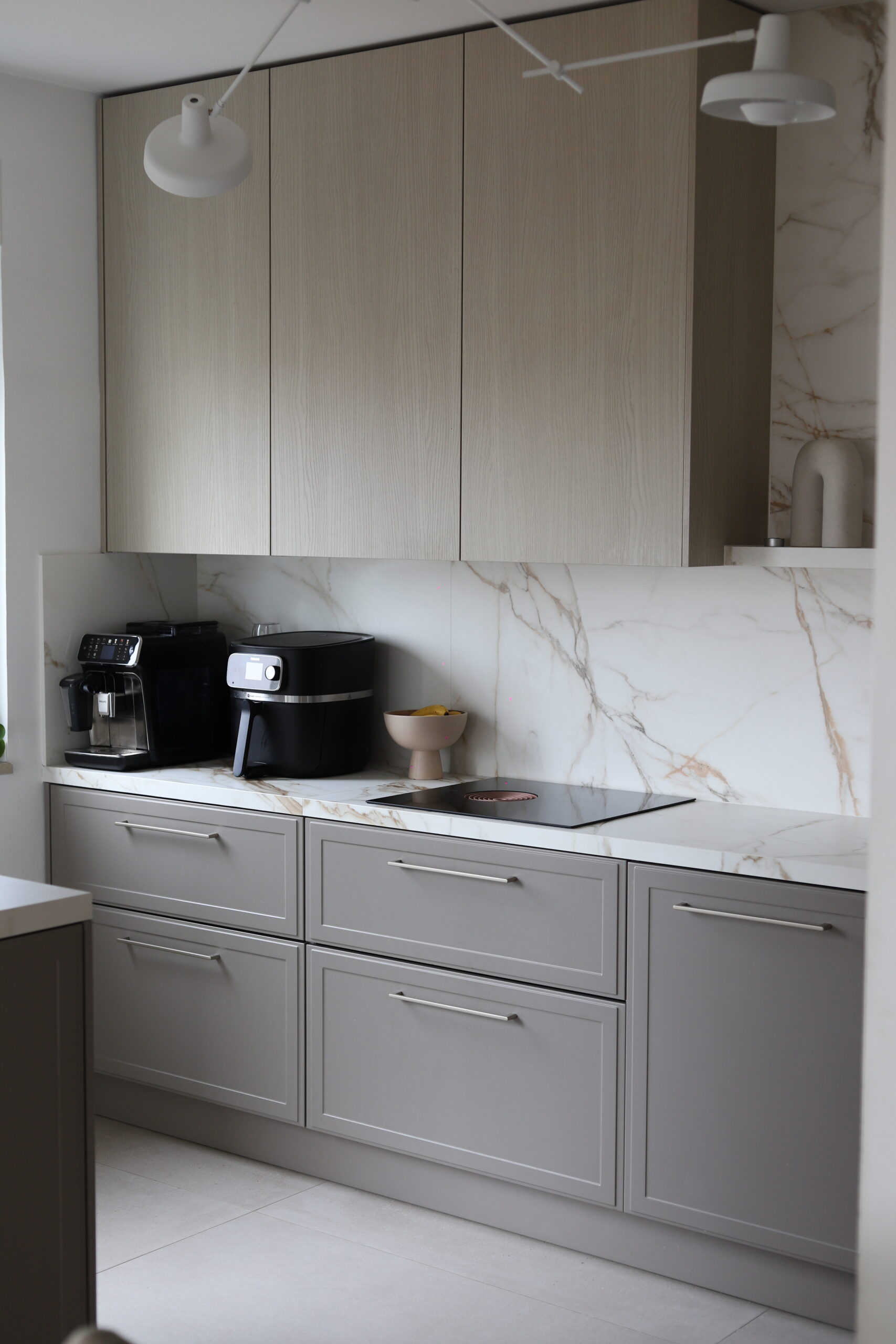 Gornje fronte su iz Nolte NEO kolekcije kuhinja, Neo Leaf fronta u sand ash nijansi, kako kažu; poput pješčanog pepela. Ono što je mene privuklo je sama obrada gdje su godovi i nijanse imitacije drva nevjerojatno sofisticirani, decentni i toliko skandinavski! Tekstura je zrnasta, na dodir se pod prstima fino osjete linije i to mi je toliko toplo i autentično. Svi drugi ostali elementi (tj. većina) su iz Torino Lack kolekcije kuhinja – lava soft mat fronte. Diskretan stil, jasan dizjan, ja bih rekla klasika.