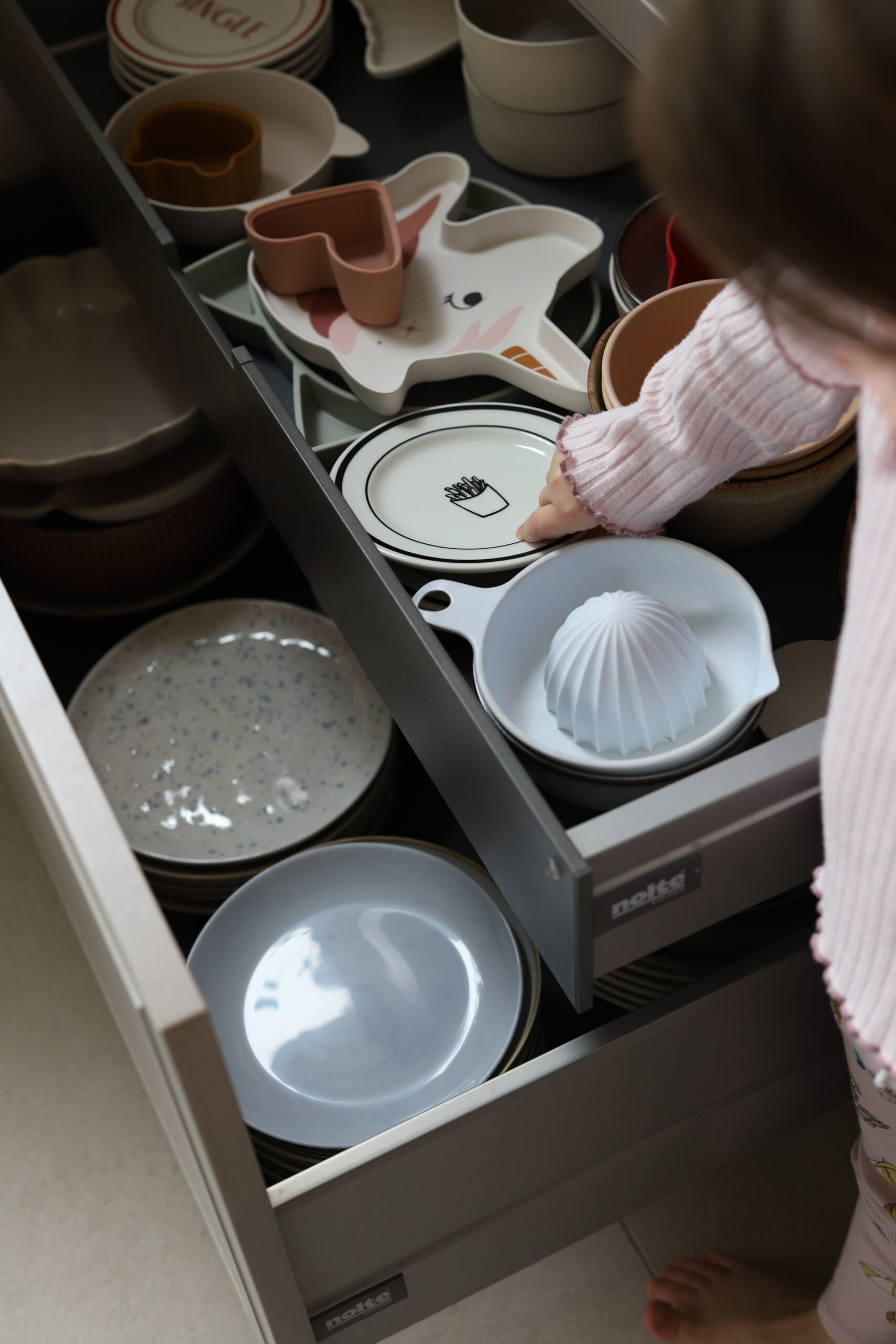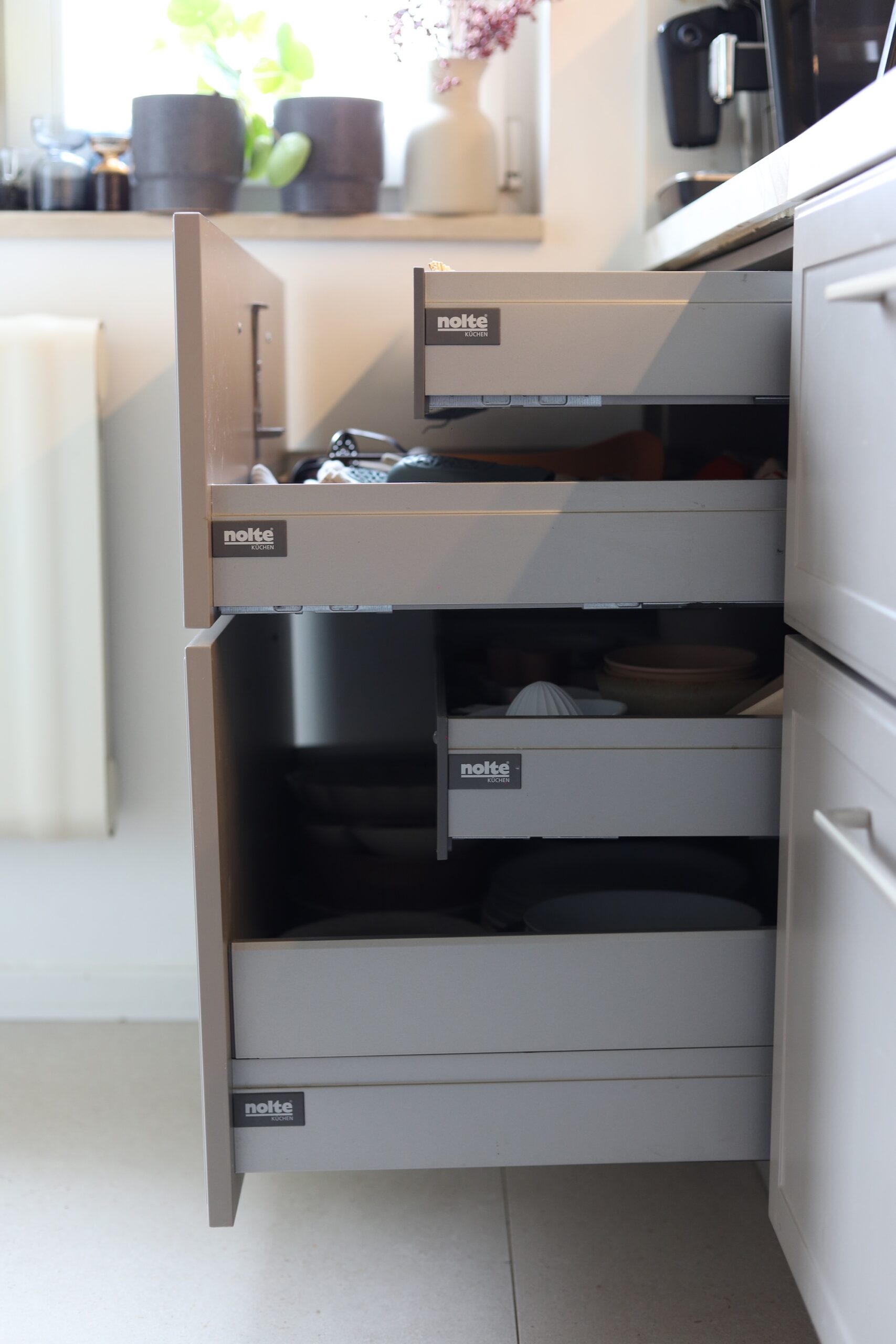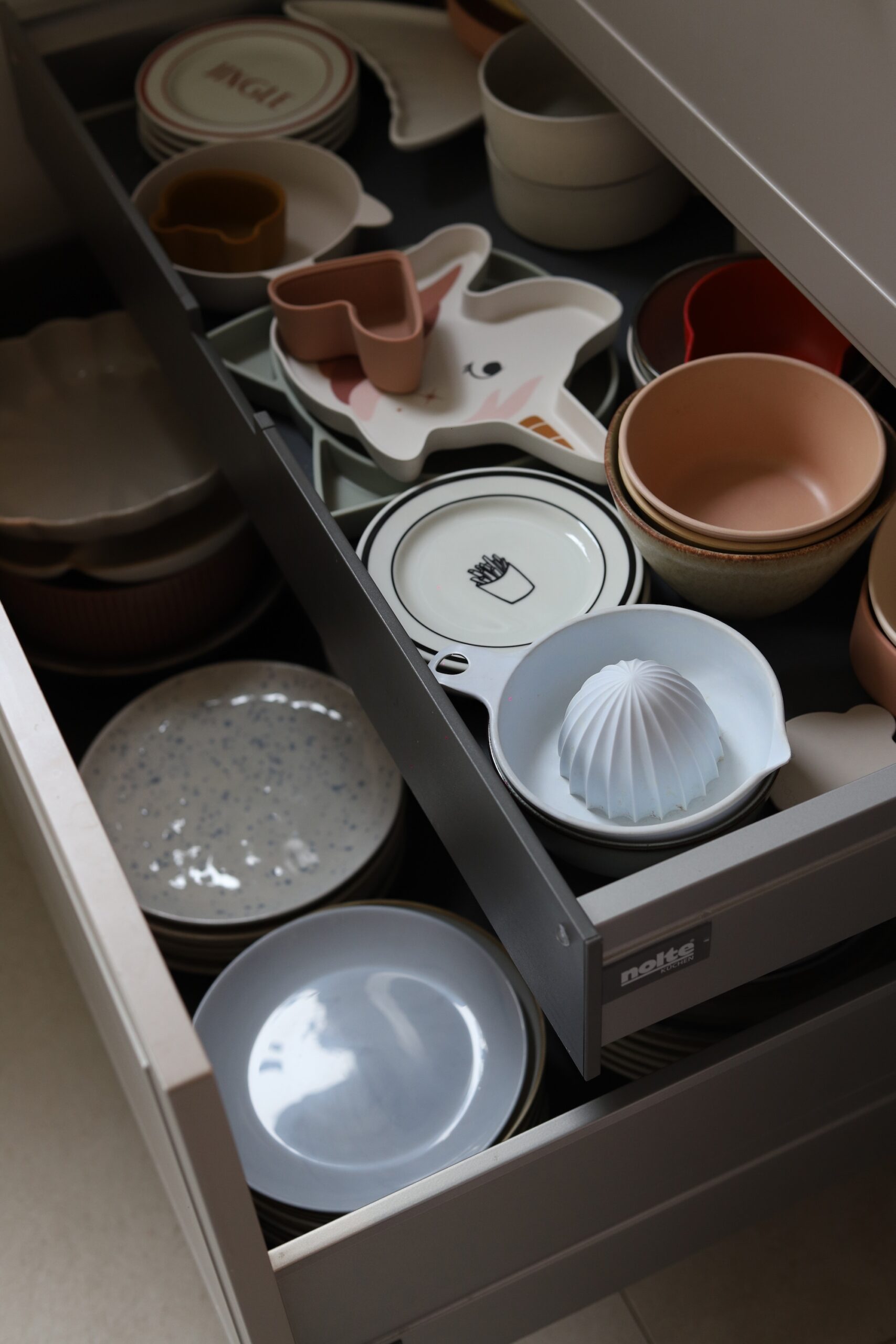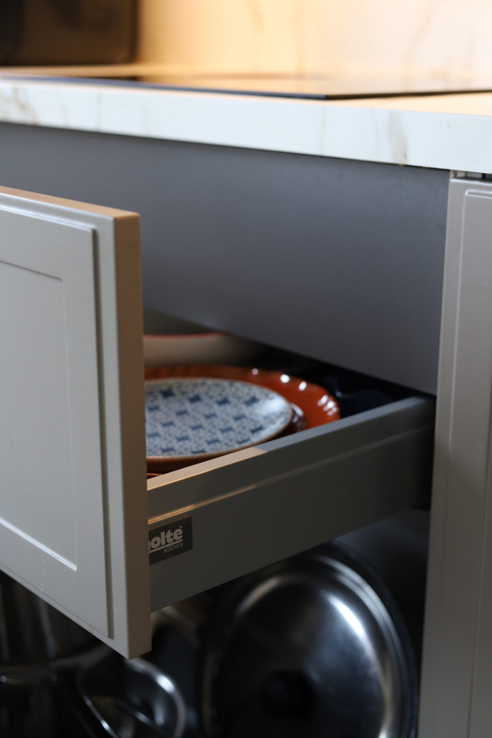 Ostalo mi je za još jednu ladicu u koju sam smjestila veće tanjure i pladnjeve. Zanimljivo je da sam planirala klasičnu napu u gornjem elementu te promijenila mišljenje kad sam došla u Nolte kuhinje. Prostor kojeg je zauzela ugradbena napa je 19 cm, a dubina ladice je 9 cm. Mislim da je integrirana napa ogromna stvar za estetiku. Daje čisti look radne površine.