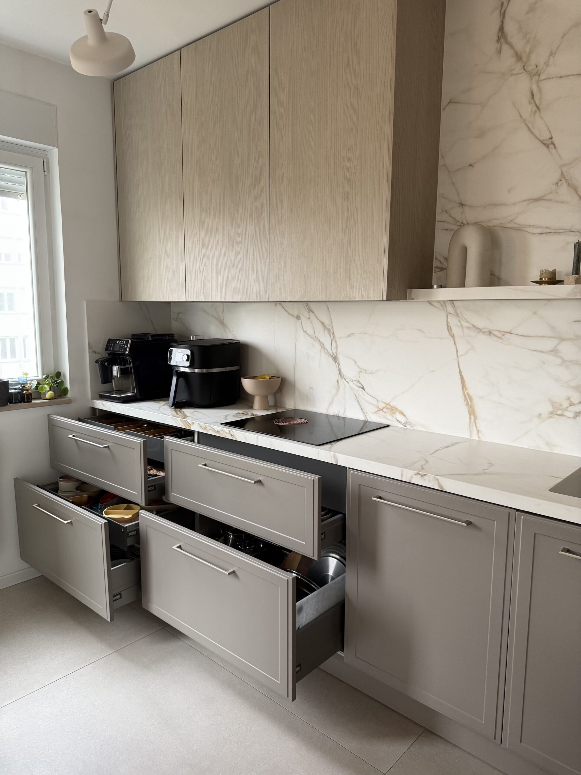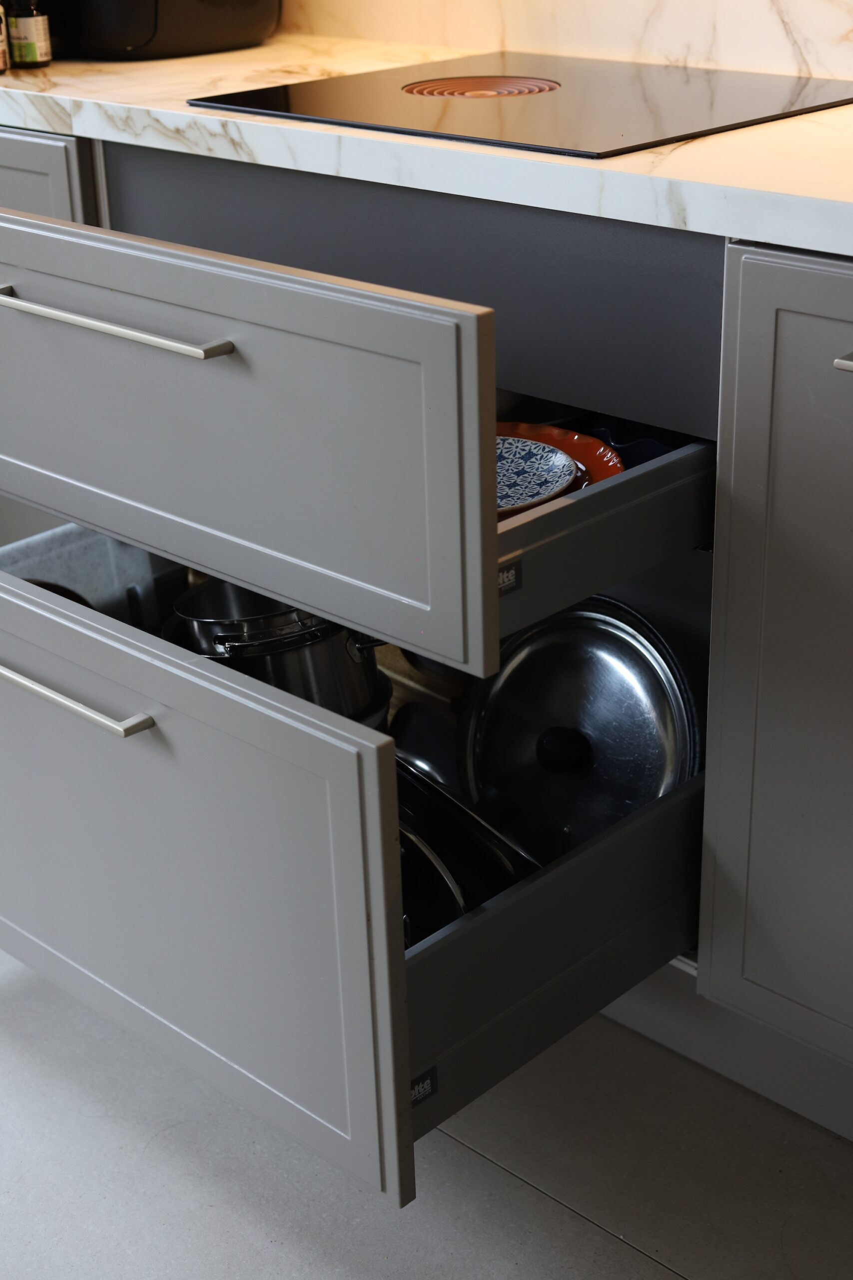 Najveća ladica je upravo ona ispod ugradbene nape, dubine 18 cm, ali sama ladica je 45 cm, tako da mi u nju stanu svi veliki lonci, tavice i poklopci. I to mi je zapravo sve skupa praktičan raspored jer sve što trebam uz kuhalište mi je nadohvat ruke i nema potrebe za hodanjem po kuhinji. Začini su iznad kuhališta u visećim elementima.