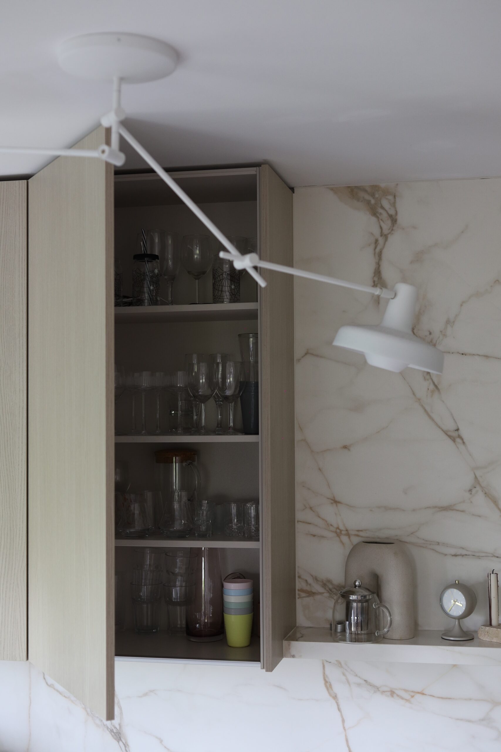Mi smo stavili ugradbena svjetla u vitrinu i cijelom dužinom ispod visećih gornjih elemenata te se svjetla nastavljaju kroz keramičku policu na zidu s keramikom. Dogovorila sam s ekipom iz Noltea da naručimo dodatna svjetla za keramiku kako bi niz ugradbenih svjetla bio jednak. Svjetlo je cijelom dužinom ravnomjerno i to je ono što navečer daje cijeli mood.
