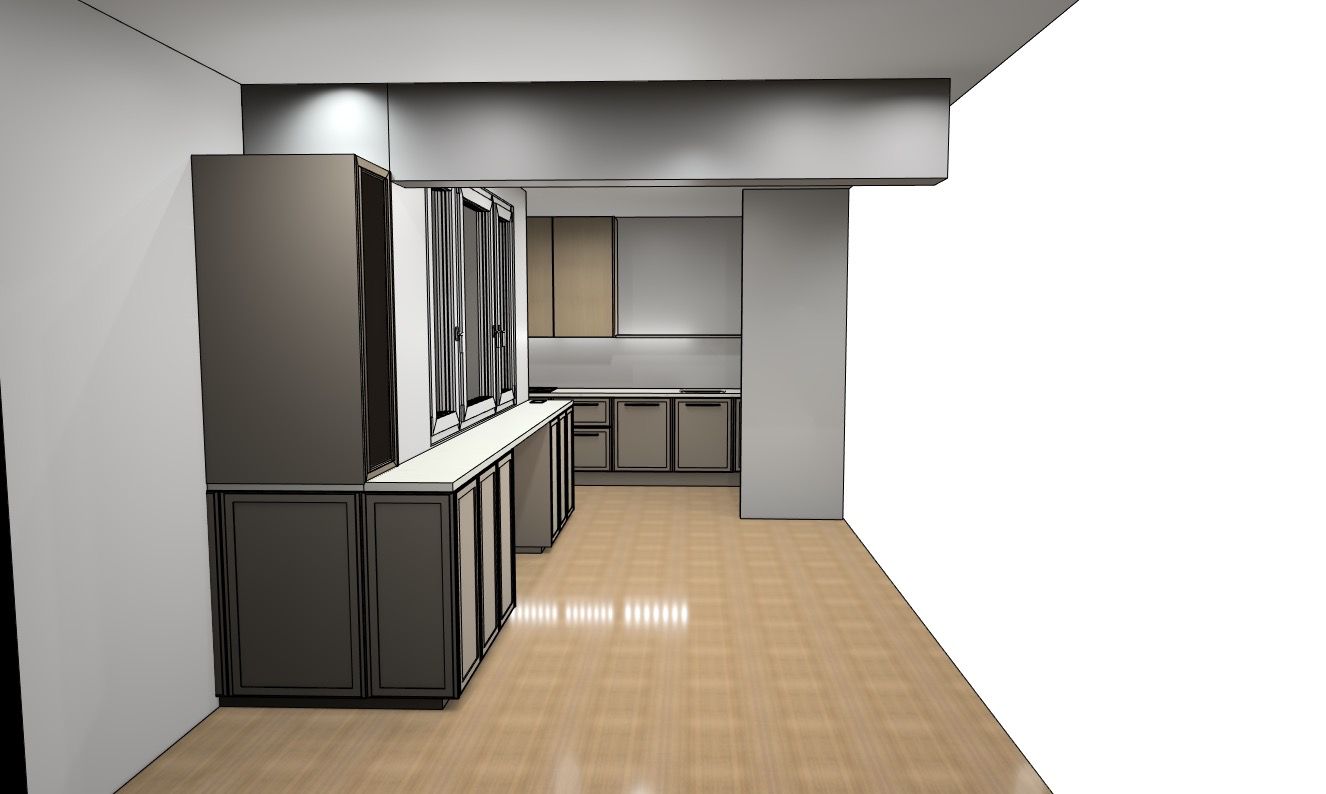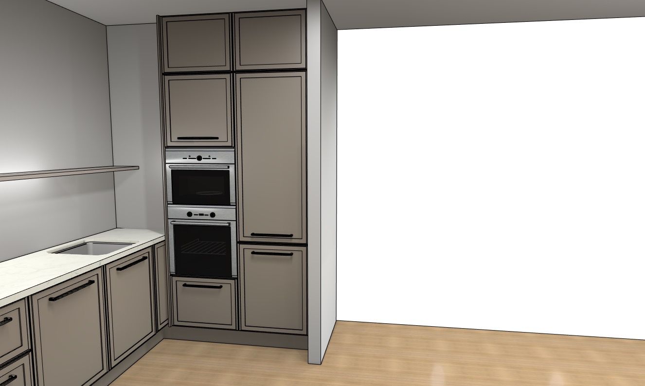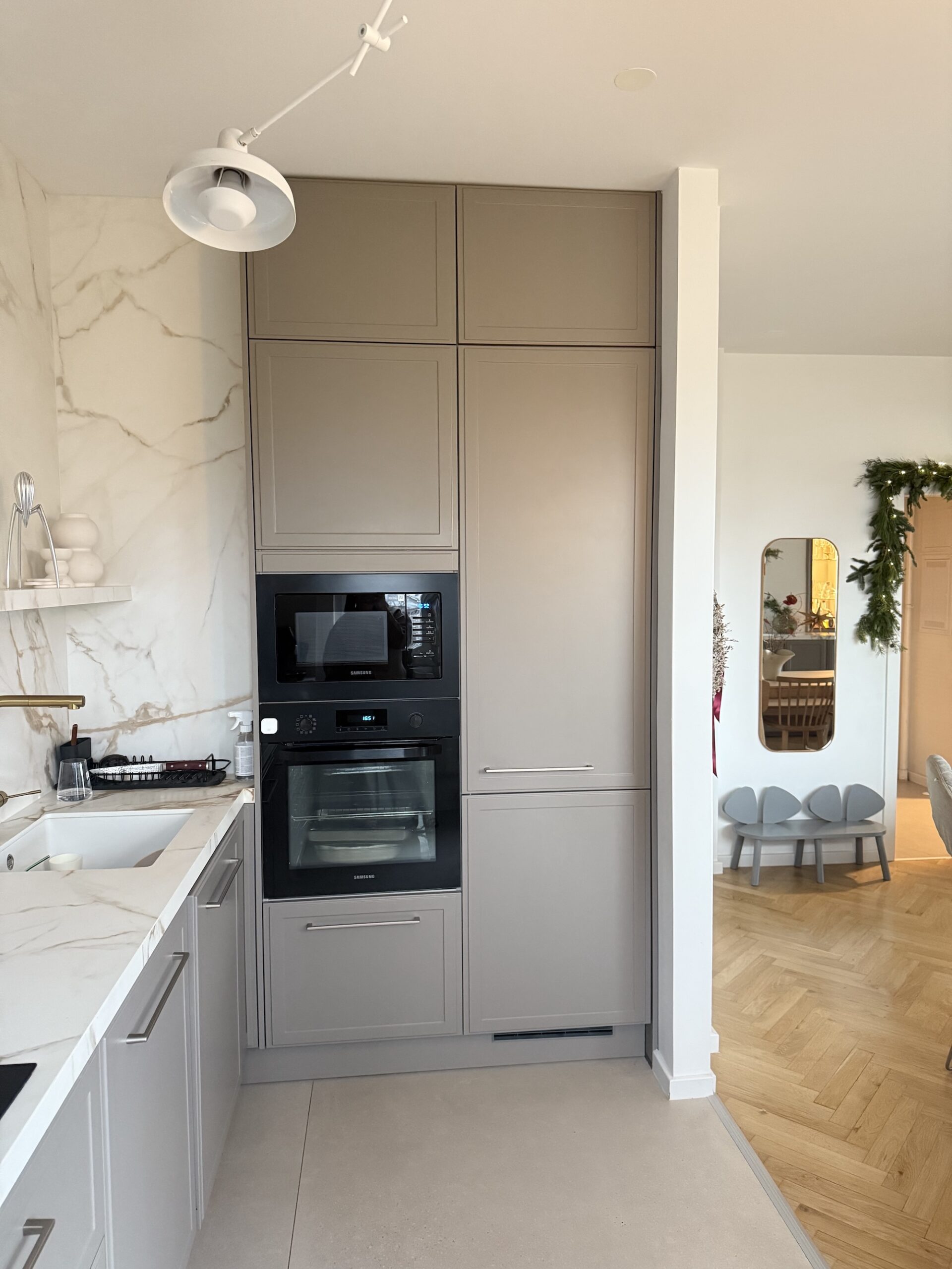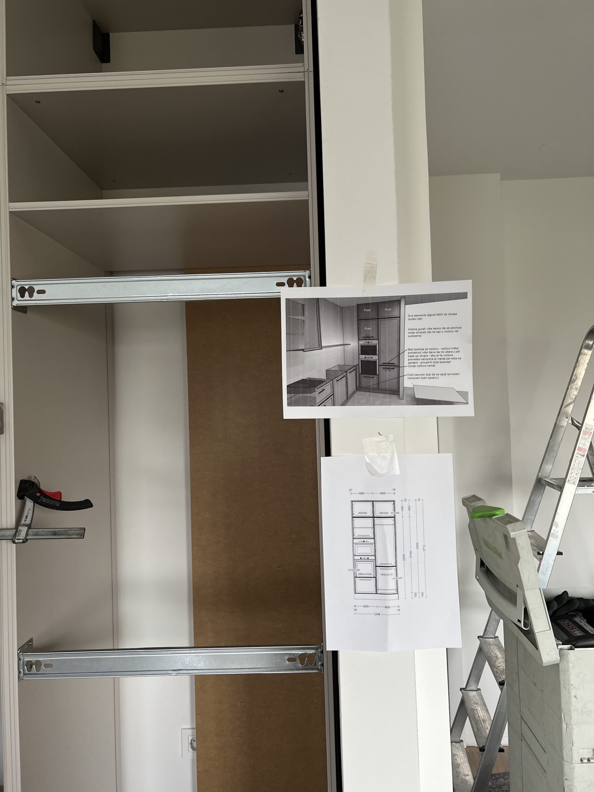 Desno u kuhinji nalazi se ugradbeni frižider, ugradbena pećnica i mikrovalna. Kako imamo špajzu, u njoj se nalazi škrinja tako da nam je frižider bez ledenice. Iskoristili smo maksimalno prostor iznad frižidera, iznad mikrovalne, i ispod pećnice. Dimenzija cijelog tog bloka je visina od pod do stropa ( visina našeg stana je 271 cm) i 120 cm širine.