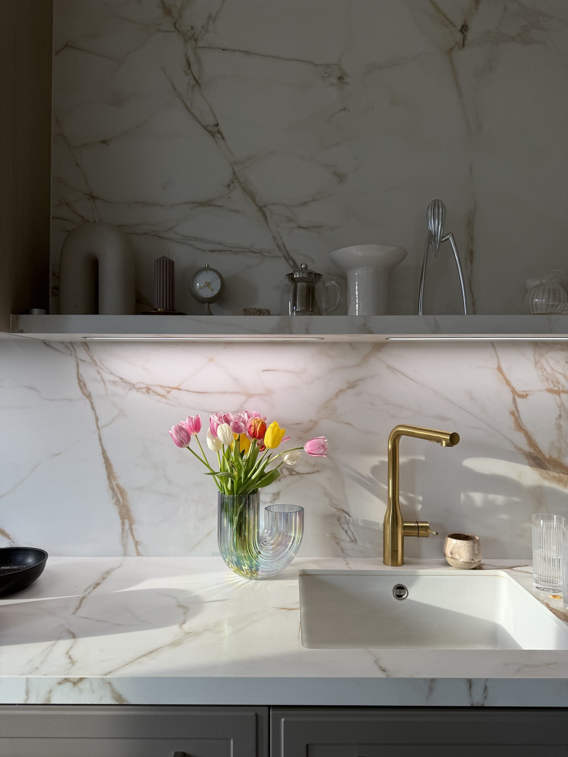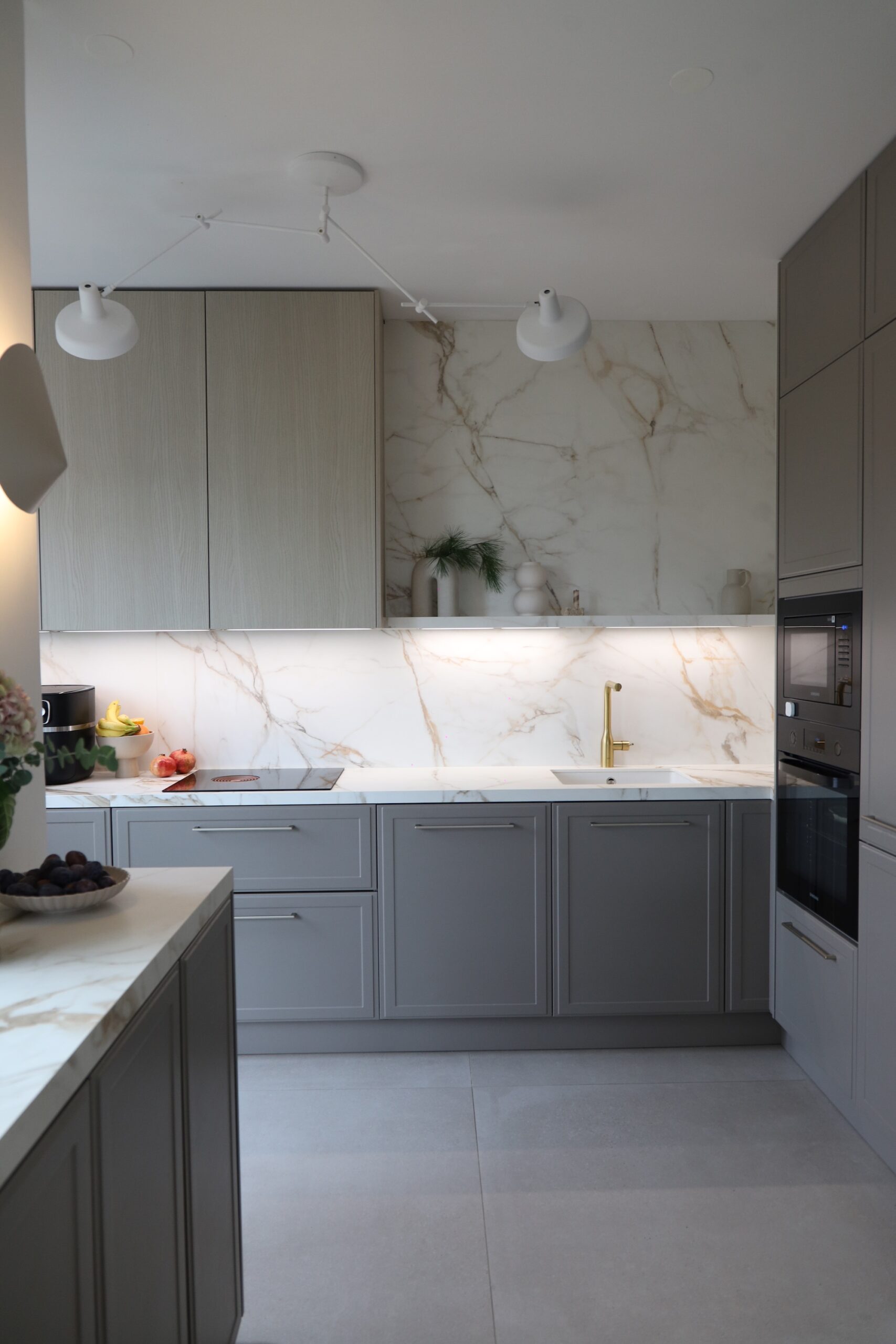 Rasvjeta je možda po meni podcijenjena, ali ključna! Rasvjeta ovdje radi pola atmosfere, i nemojte štedjeti na njoj. Meni je čak pomalo žao što nisam stavila rasvjetu i na bočne stranice ladica. Kombinacija osnovnog i ambijentalnog svijetla je sve! A svjetlo ispod elemenata mi je game changer za večer kad namjestim “toplu” temperaturu svjetla.