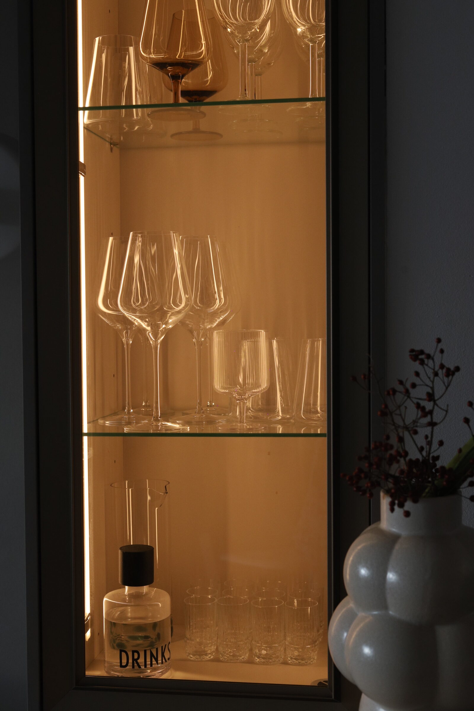 Od samog početka stvaranja te moje idealne kuhinje o kojoj sam maštala, imala sam želju da imamo neku lijepo ostakljenu vitrinu. Kad sam ugledala ovu, znala sam da je to to! Predivna nijansa i dizajn! Dimenzije vitrine su 135 cm visine i 40 cm širine. Ono što mi je bitno je da vitrina bude “mirna”, da ne bude prenatrpana. I super mi je što kod nje također mogu birati toplinu svjetla, a volim tu “žućkastu” toplu nijansu koja stvara prekrasnu cozy atmosferu.
