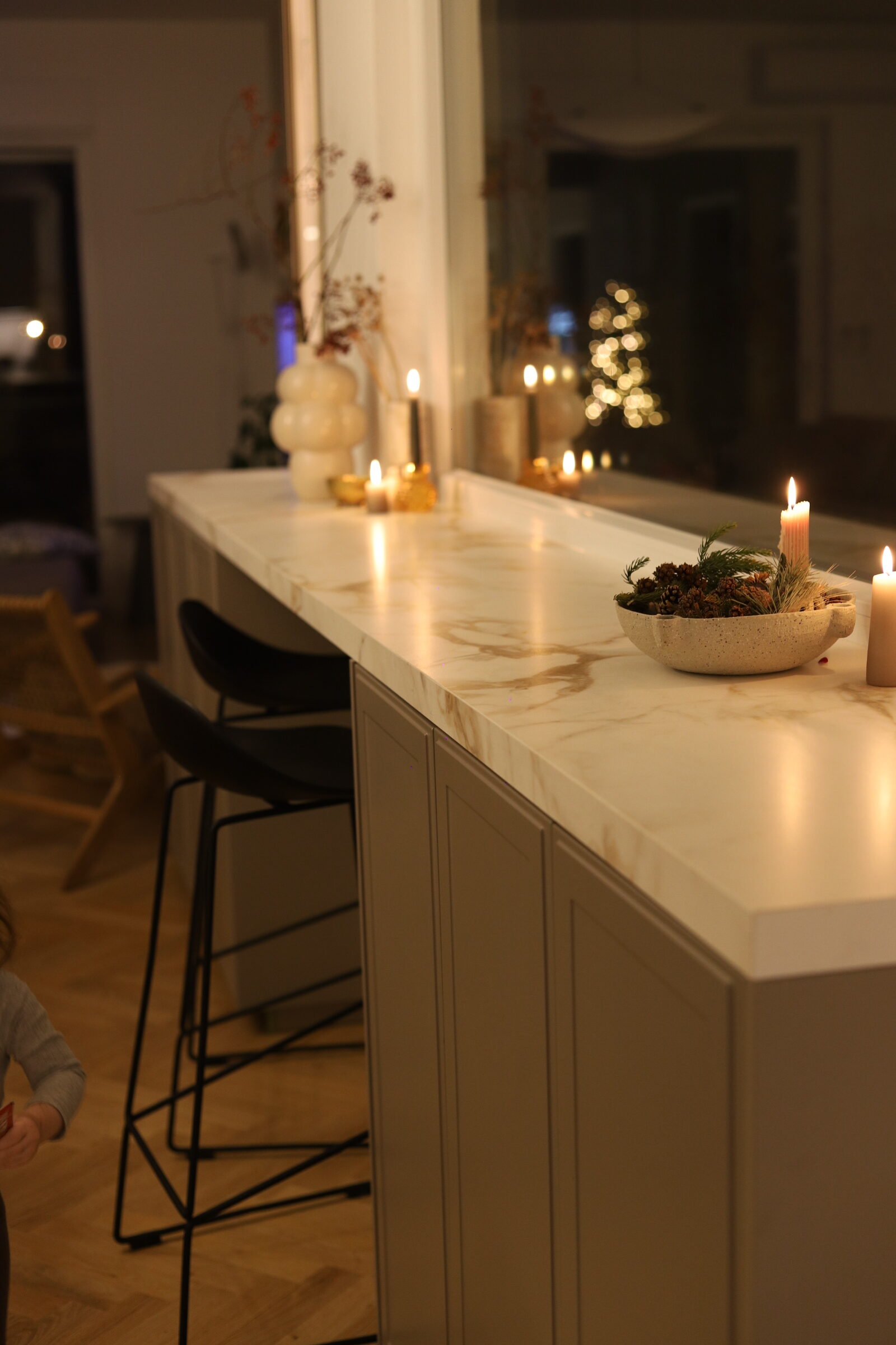 Moja je debljina 4 cm, istu tu debljinu prati i šank i polica. Vjerujem da ova debljina na koju sam se odlučila daje dozu luksuznosti i elegancije, iako su tanje ploče modernije. U početku sam se malo brinula da bi ova debljina bila prenapadna, ali na kraju se sve jako lijepo izbalansiralo sa šankom i policom.