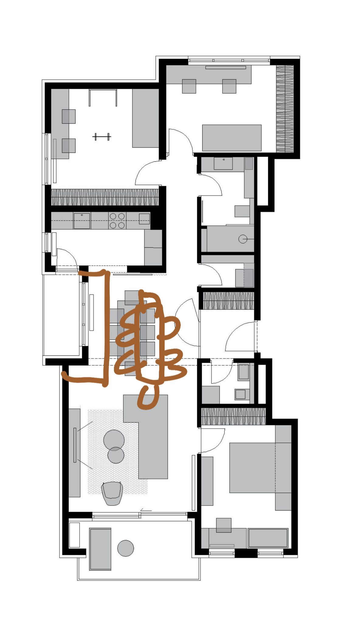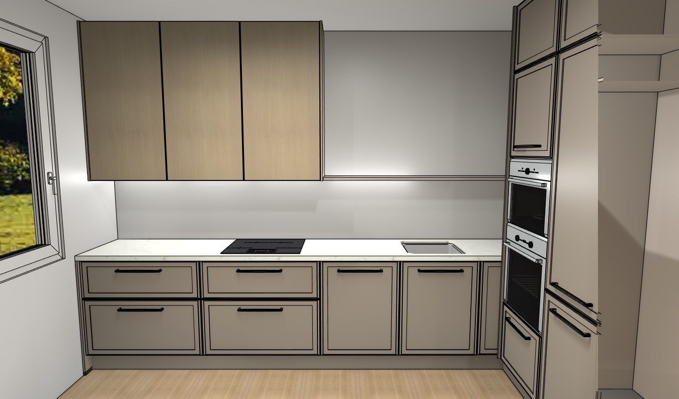 Nakon nekoliko preporuka odlučila sam otići do Notle kuhinje showrooma. Imala sam par idejnih rješenja/skica kuhinje (varijante i sa kuhinjskim otokom, što mi je na početku bilo čak najinteresantnije), a odluka je pala na onu sa šankom ispod prozora. Od starta sam znala da želim jedan zid kompletno obložen keramikom, također polica obložena keramikom s ugradbenim svjetlima, i vitrina na šanku! Znala sam da želim porculansku keramiku, ali bila sam neodlučna oko samih fronti. Nisam bila sigurna ni za boju, ni za uzorke. Ovo je moja skica kad sam shvatila da želim šank ispod prostora!