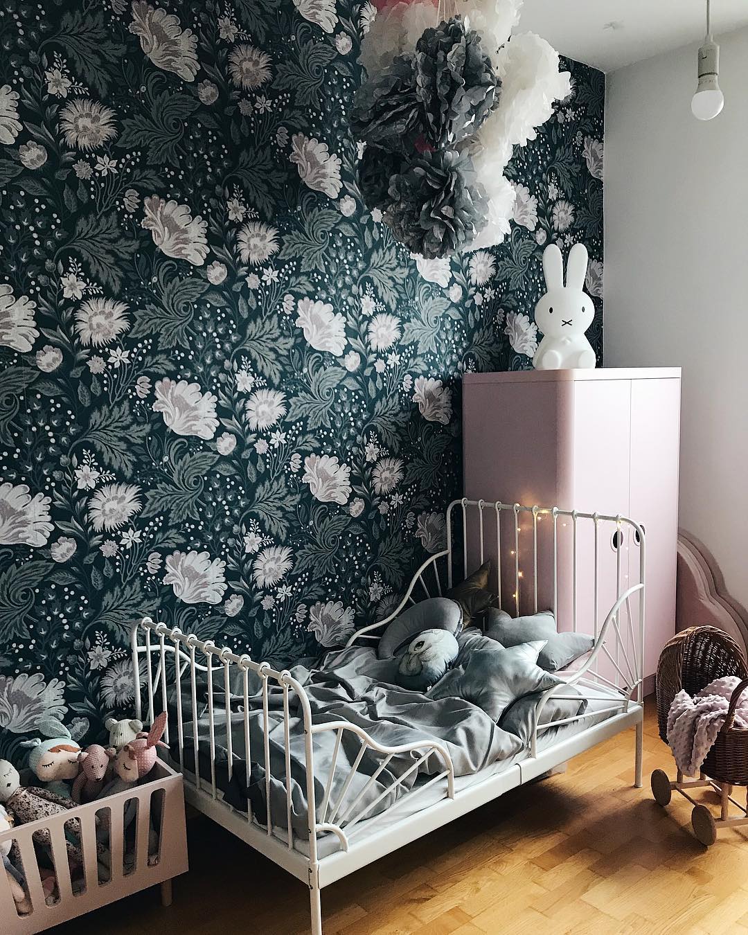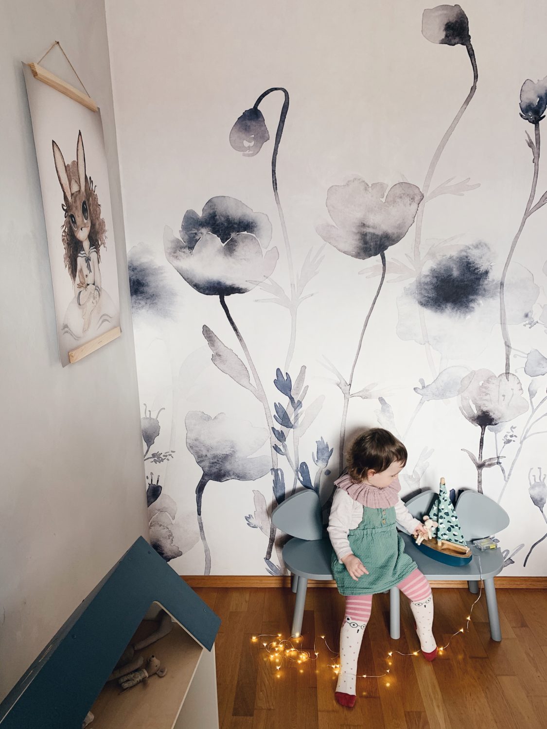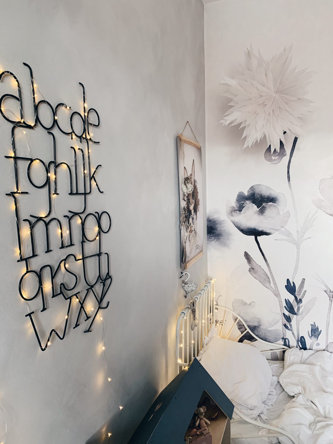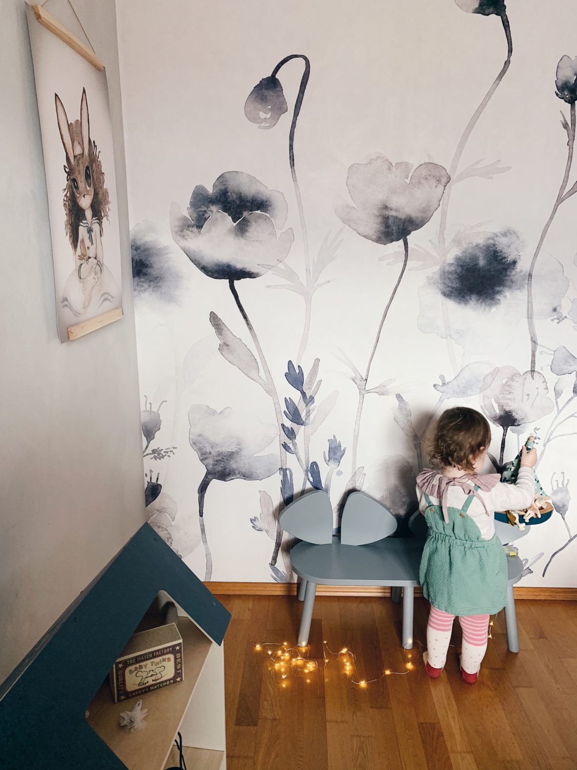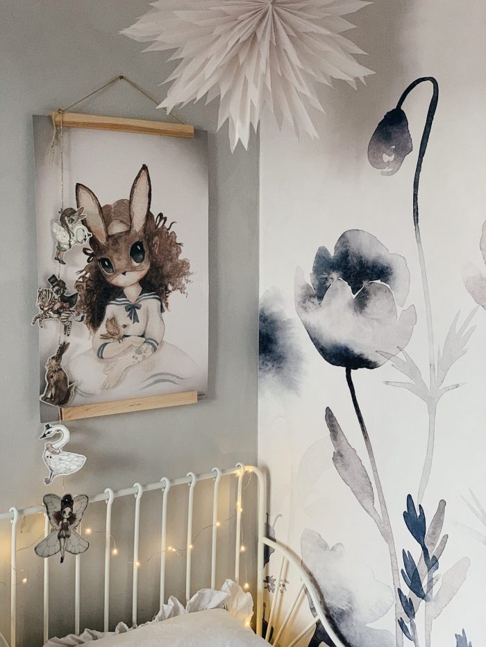 Bila sam jako uzbuđena oko ove tapete i jedva sam čekala da vidim kako će se uklopiti uz Ikein produljivi krevetić, Maileg kućicu, sivi Kalklitir zid i Mrs Mighetto detalje. Ono što je kod mene bio izazov bilo je da u sobi ne zavlada psihodelija jer vam je već poznato da na drugoj strani imamo već jedan cvjetni zid. Upravo iz tog razloga birala sam tapete s većim cvjetovima.