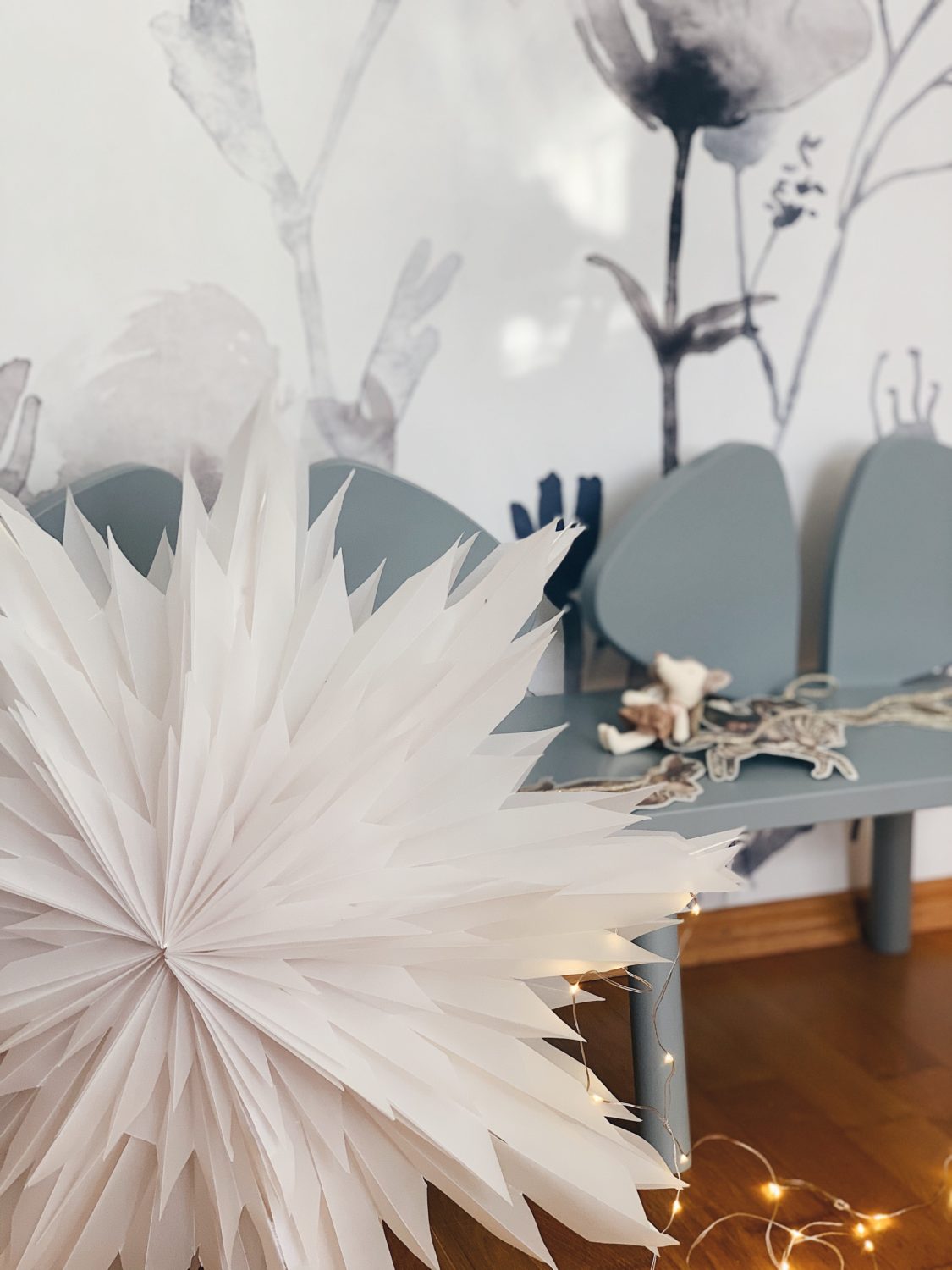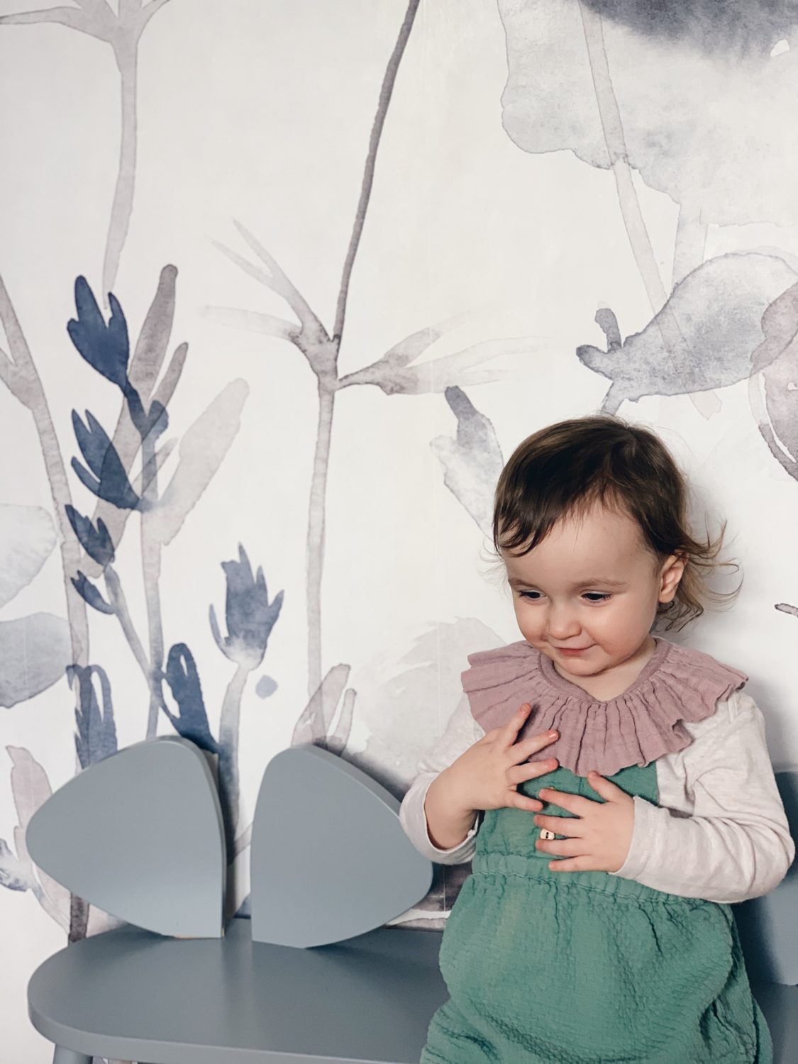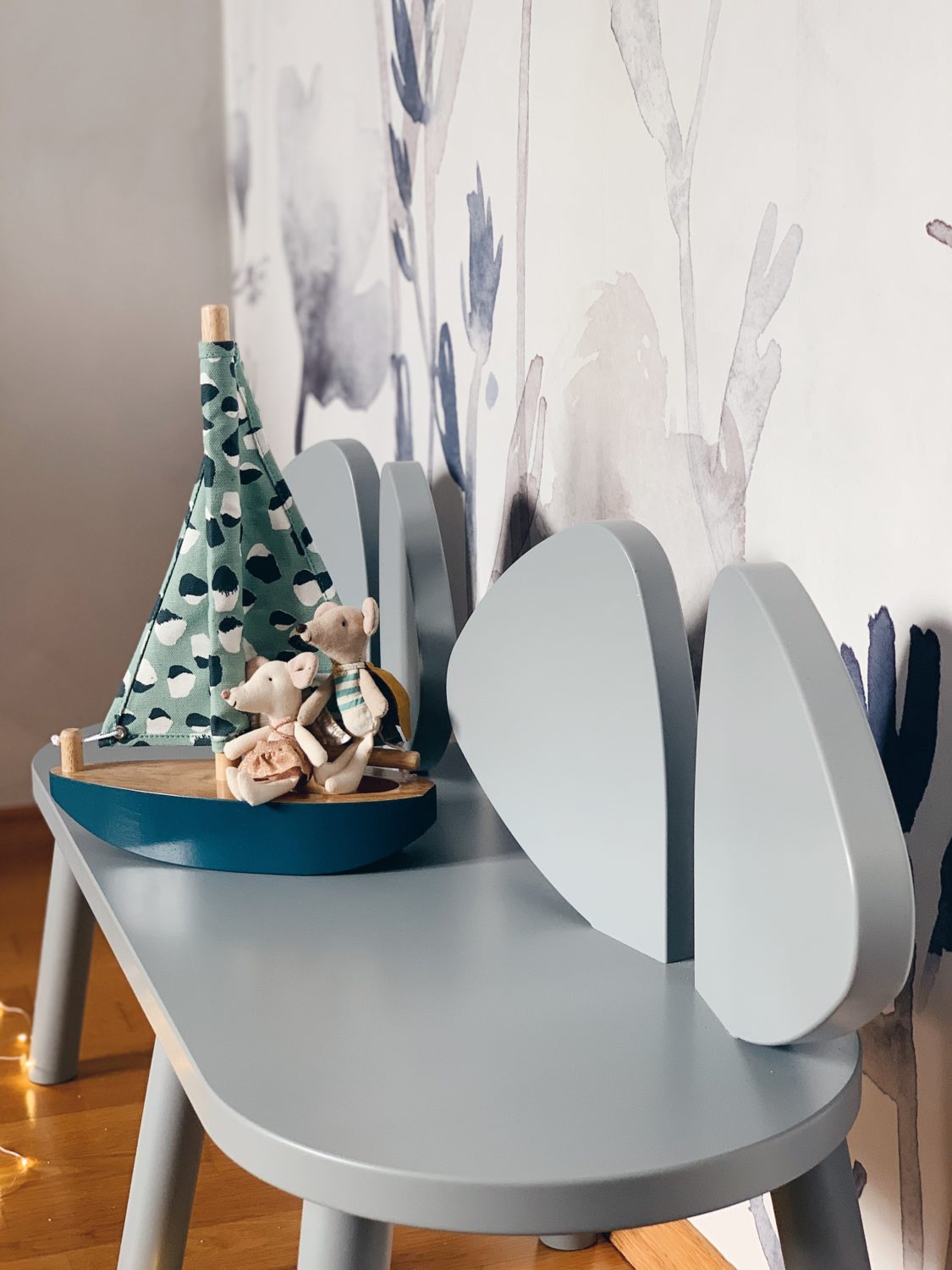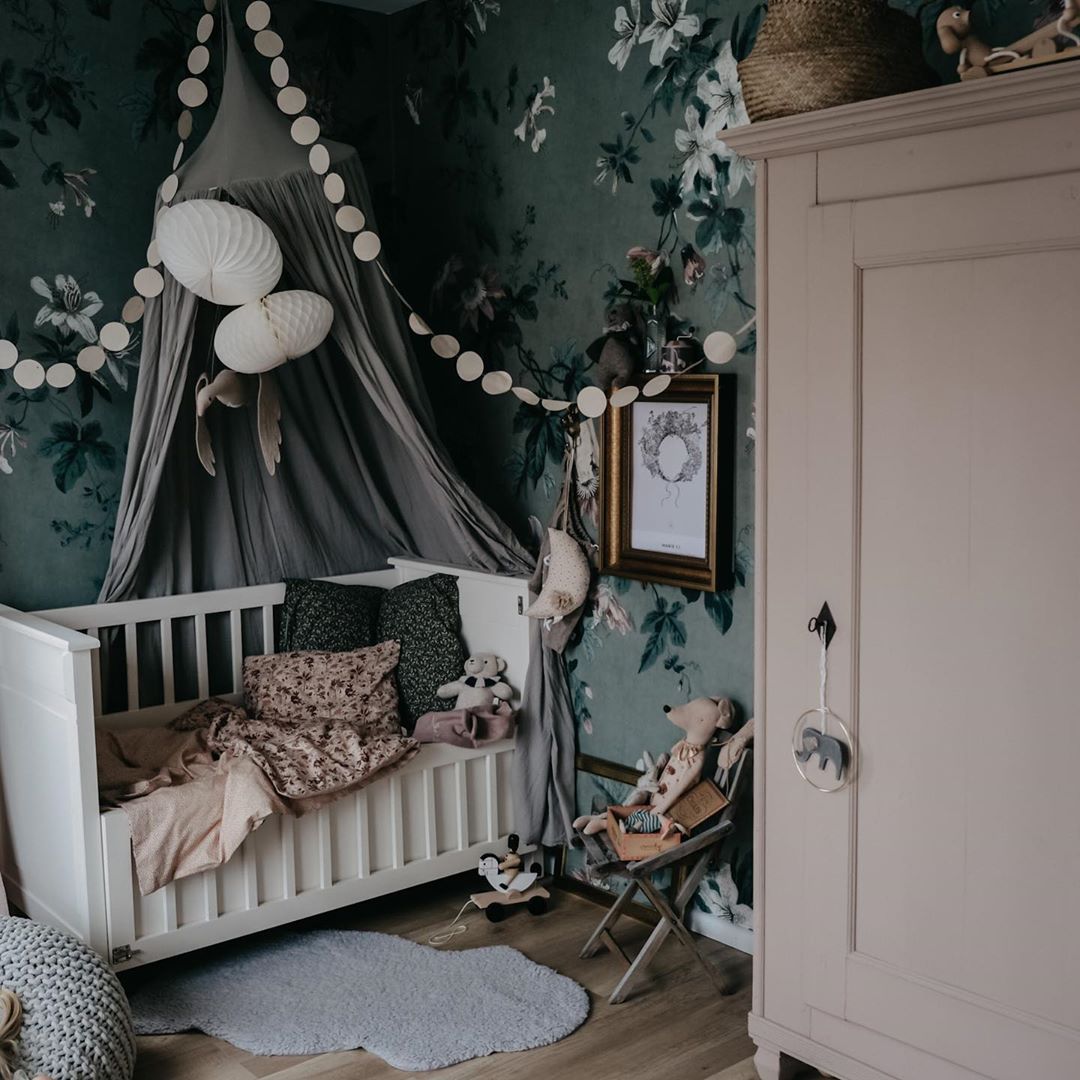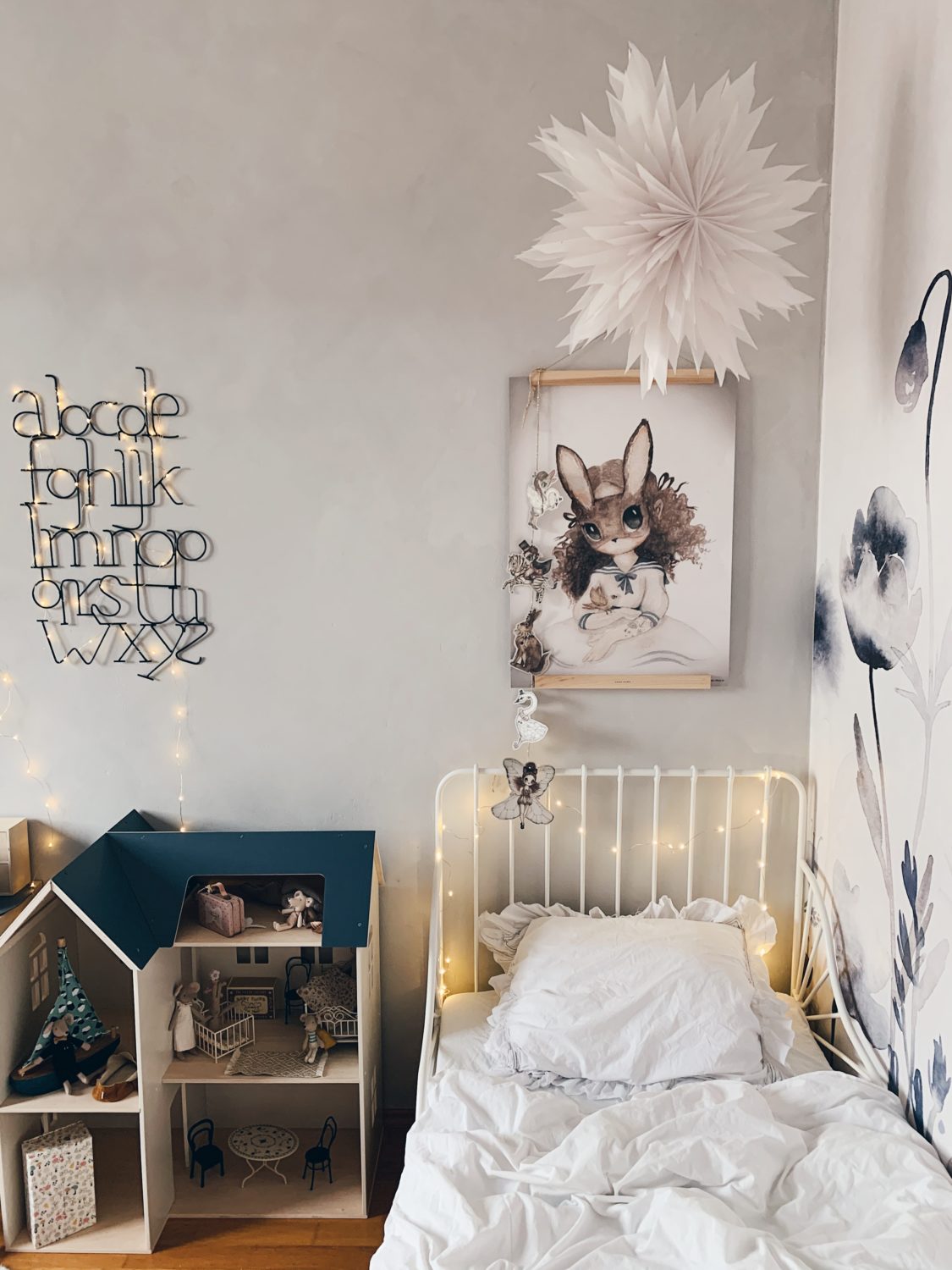 Bila sam jako uzbuđena oko ove tapete i jedva sam čekala da vidim kako će se uklopiti uz Ikein produljivi krevetić, Maileg kućicu, sivi Kalklitir zid i Mrs Mighetto detalje. Ono što je kod mene bio izazov bilo je da u sobi ne zavlada psihodelija jer vam je već poznato da na drugoj strani imamo već jedan cvjetni zid. Upravo iz tog razloga birala sam tapete s većim cvjetovima.