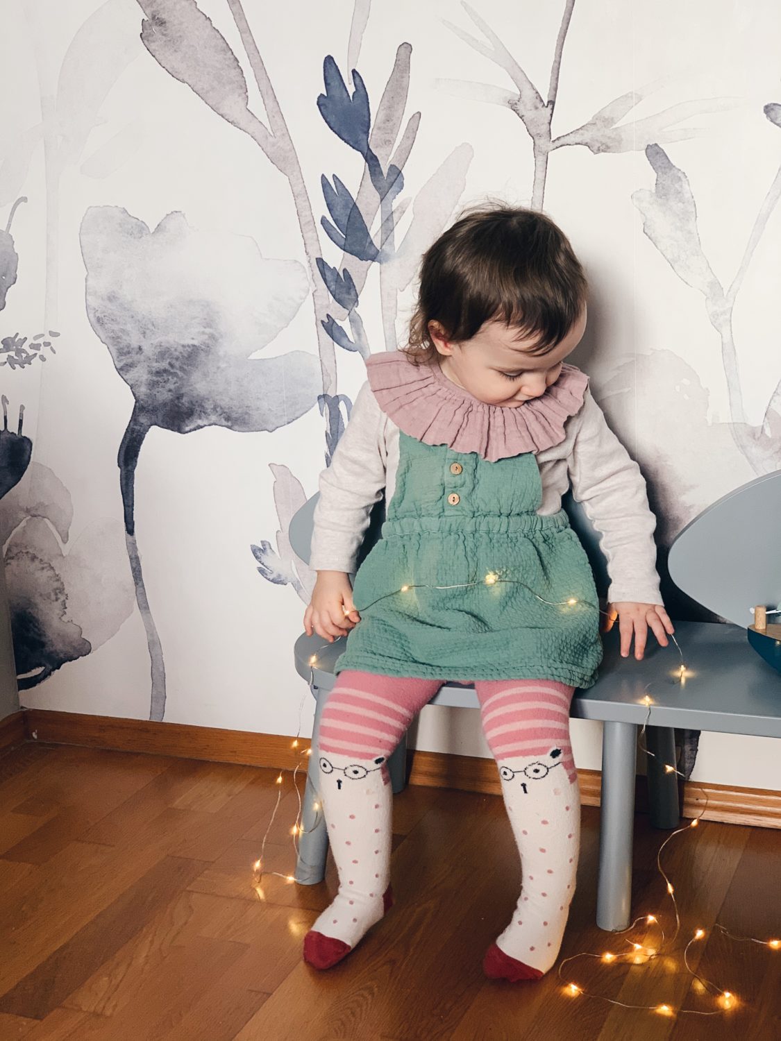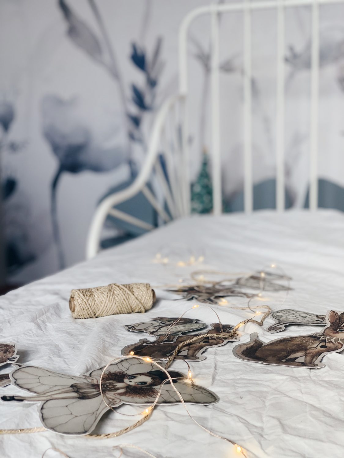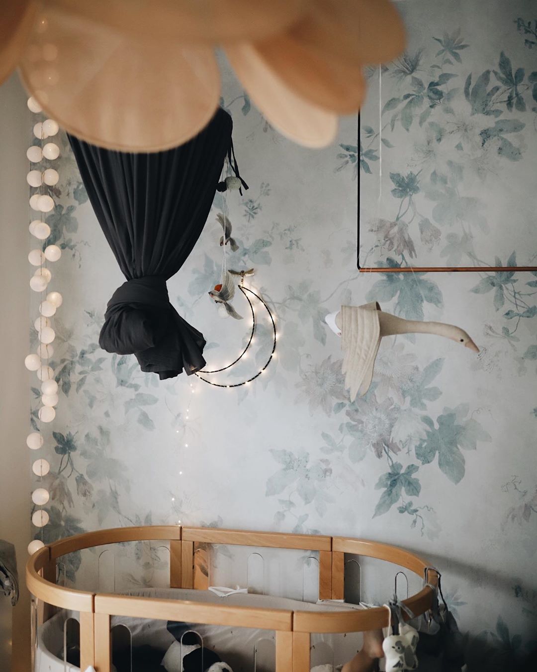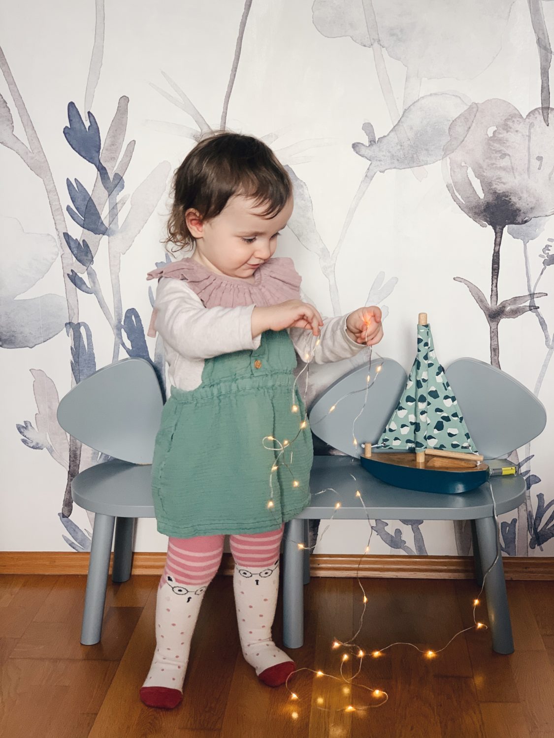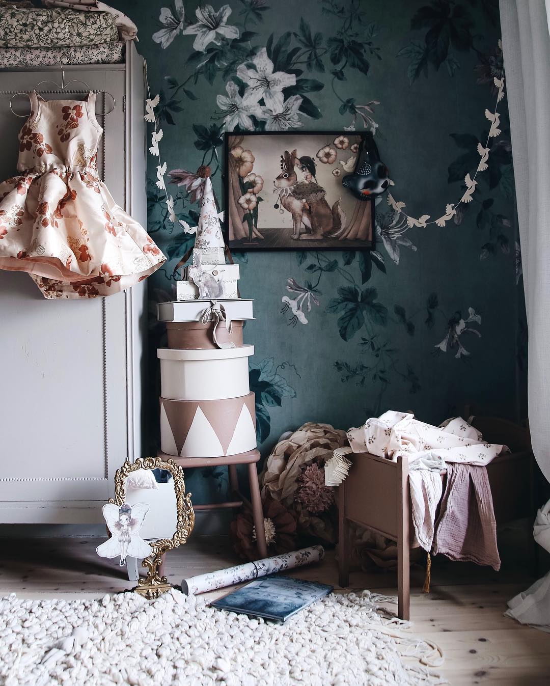 Bila sam jako uzbuđena oko ove tapete i jedva sam čekala da vidim kako će se uklopiti uz Ikein produljivi krevetić, Maileg kućicu, sivi Kalklitir zid i Mrs Mighetto detalje. Ono što je kod mene bio izazov bilo je da u sobi ne zavlada psihodelija jer vam je već poznato da na drugoj strani imamo već jedan cvjetni zid. Upravo iz tog razloga birala sam tapete s većim cvjetovima.