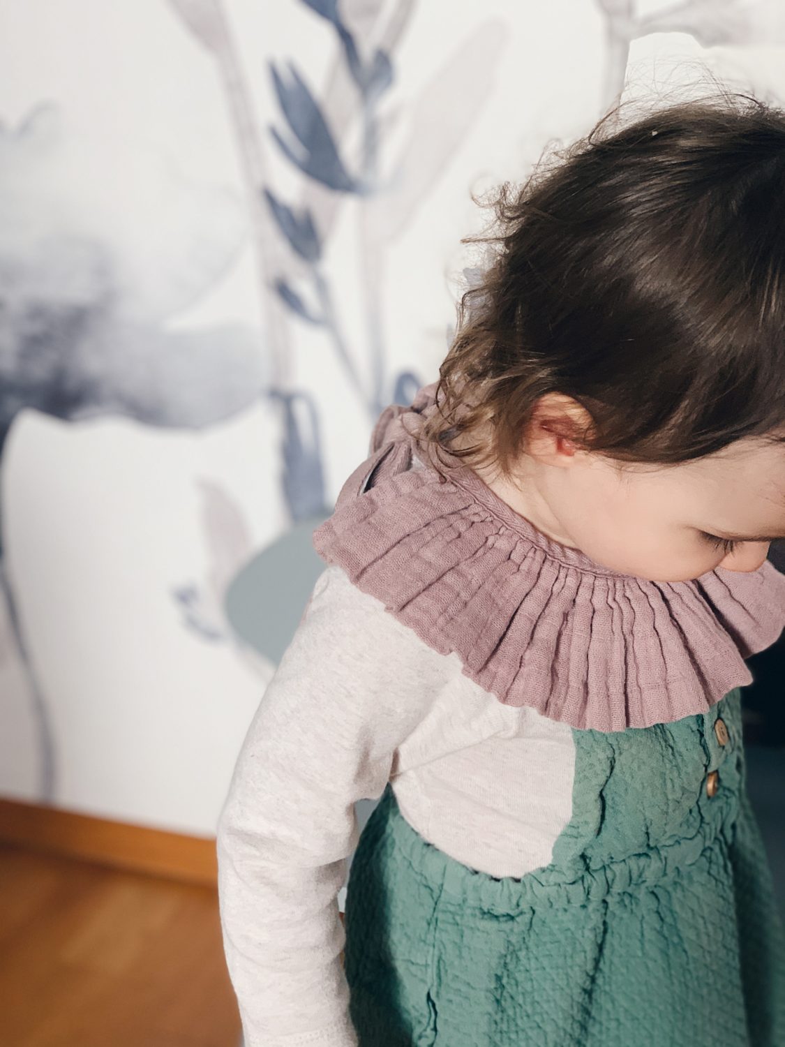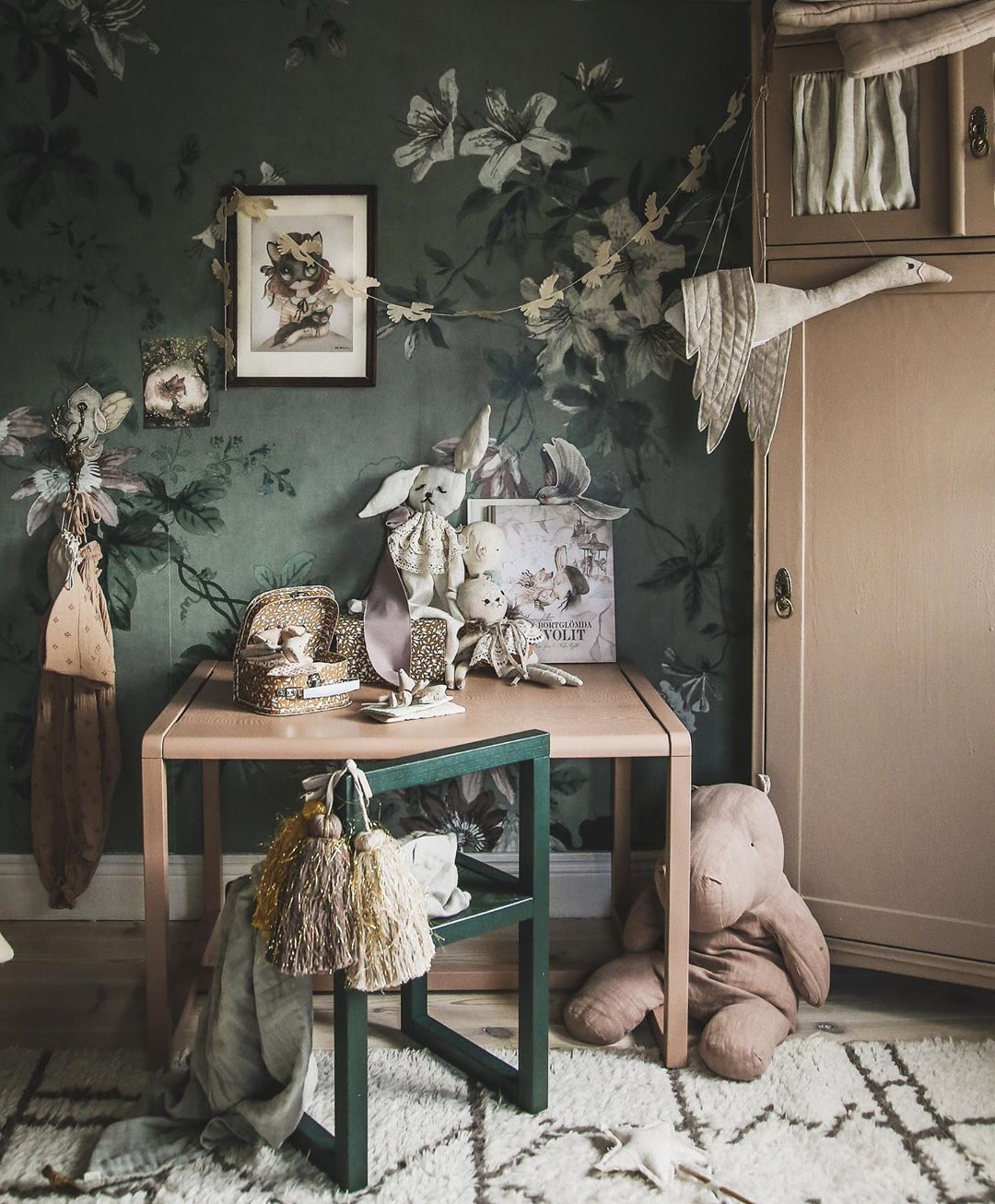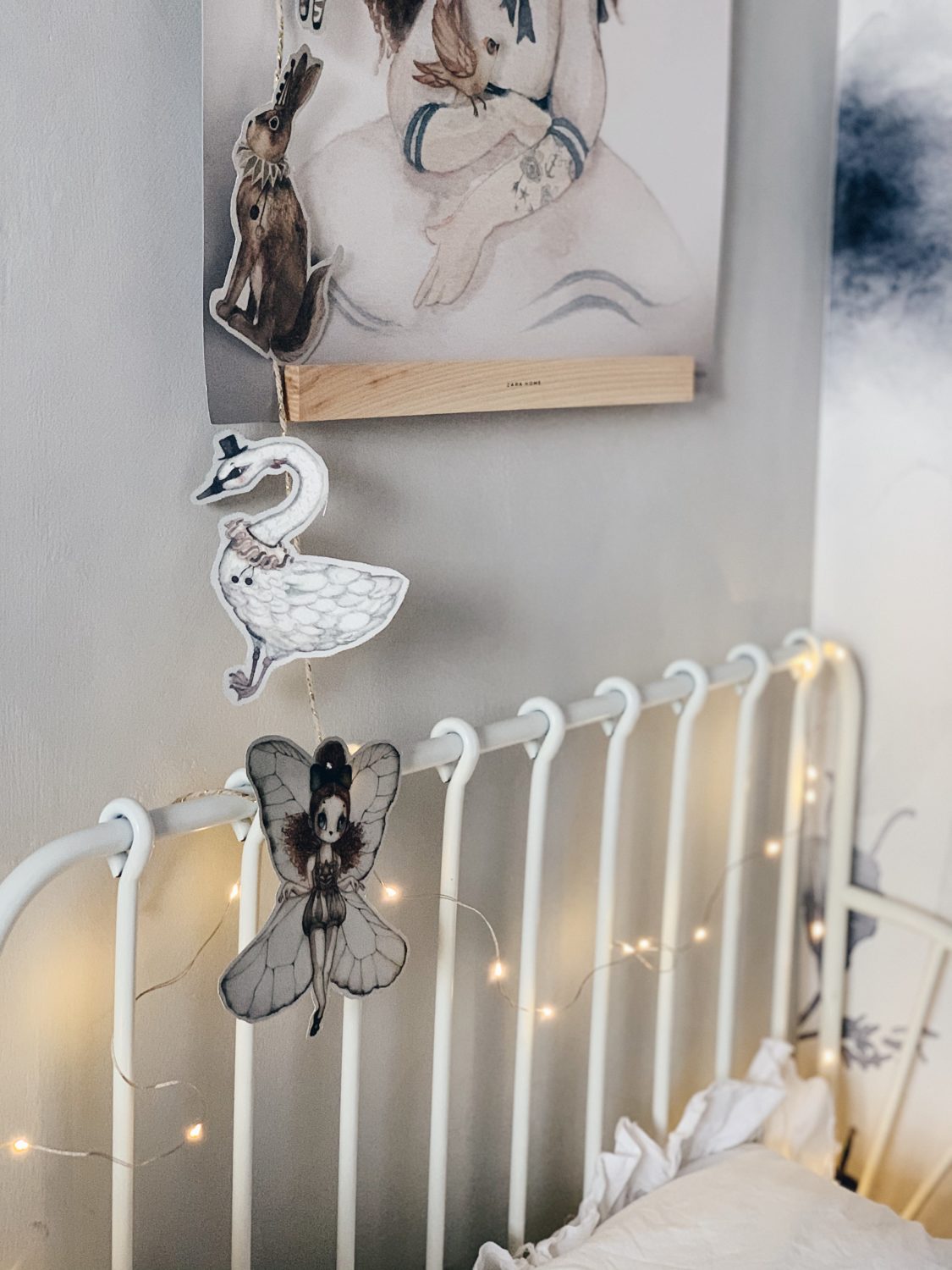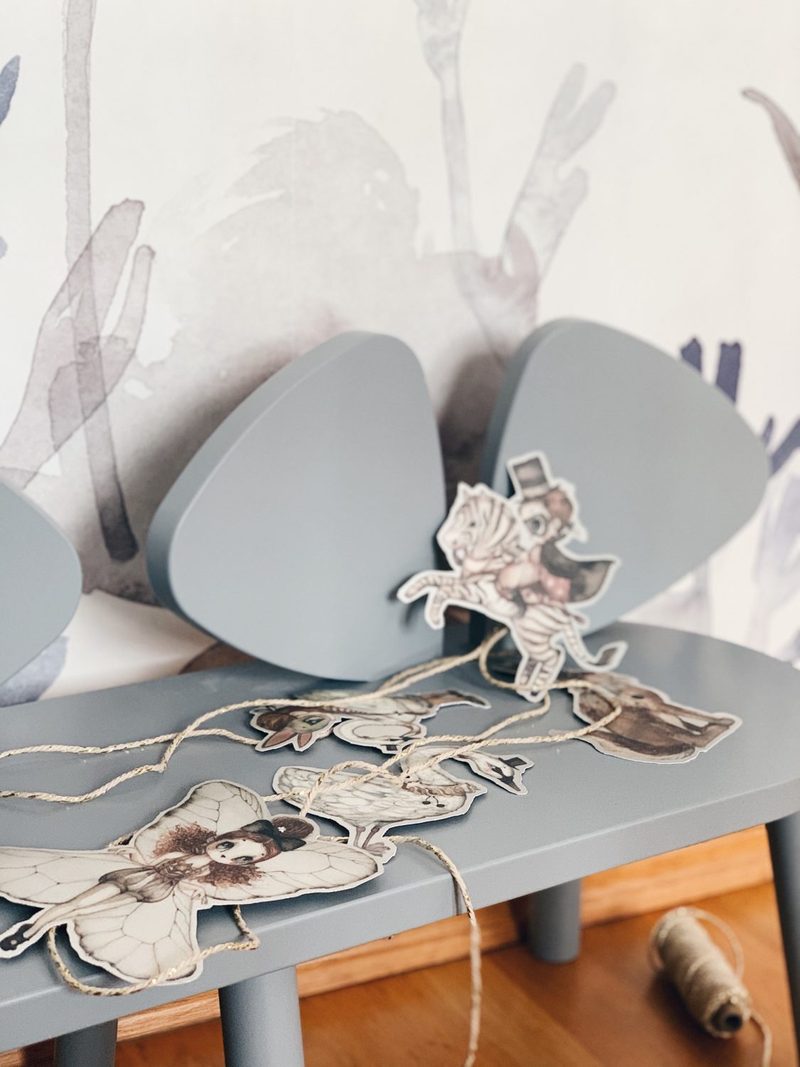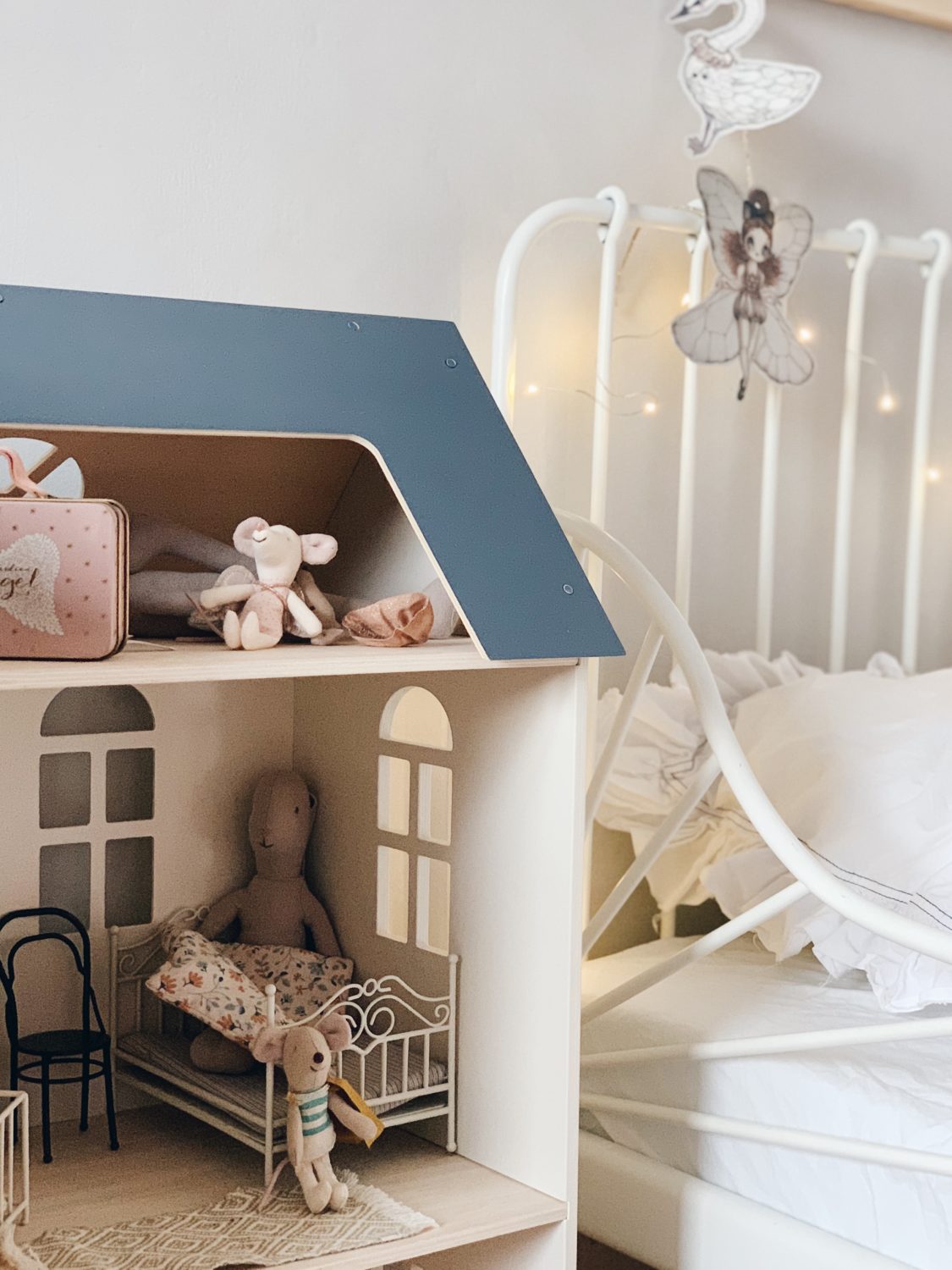 Bila sam jako uzbuđena oko ove tapete i jedva sam čekala da vidim kako će se uklopiti uz Ikein produljivi krevetić, Maileg kućicu, sivi Kalklitir zid i Mrs Mighetto detalje. Ono što je kod mene bio izazov bilo je da u sobi ne zavlada psihodelija jer vam je već poznato da na drugoj strani imamo već jedan cvjetni zid. Upravo iz tog razloga birala sam tapete s većim cvjetovima.