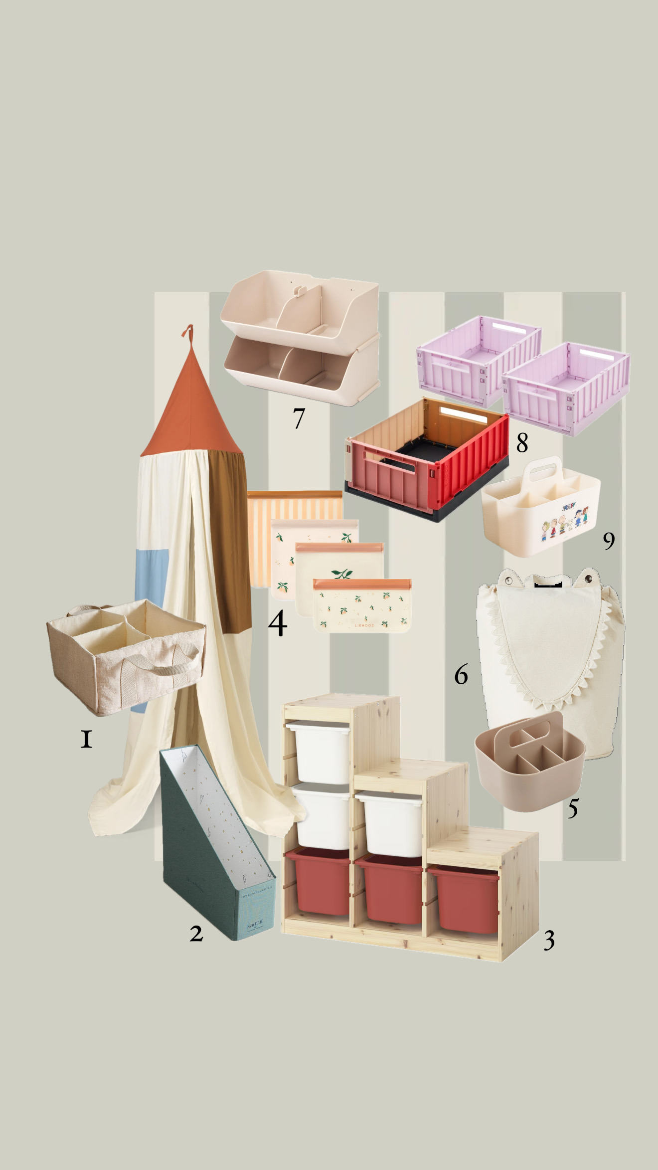 - 1. -Platnena kutija -Jysk 2. Registrator – Zara home 3. Komoda s kutijama za skladišetenje -Ikea 4. Vrećice za pohranjivanje -Liewood 5. Organizator za pisaći pribor – Liewood 6. Vreća za igračke – Ferm Living 7. Organizator za uredski pribor – Liewood 8.Kutije za pohranjivanje – Liewood 9. Kutija za pisaći pribor – Zara home