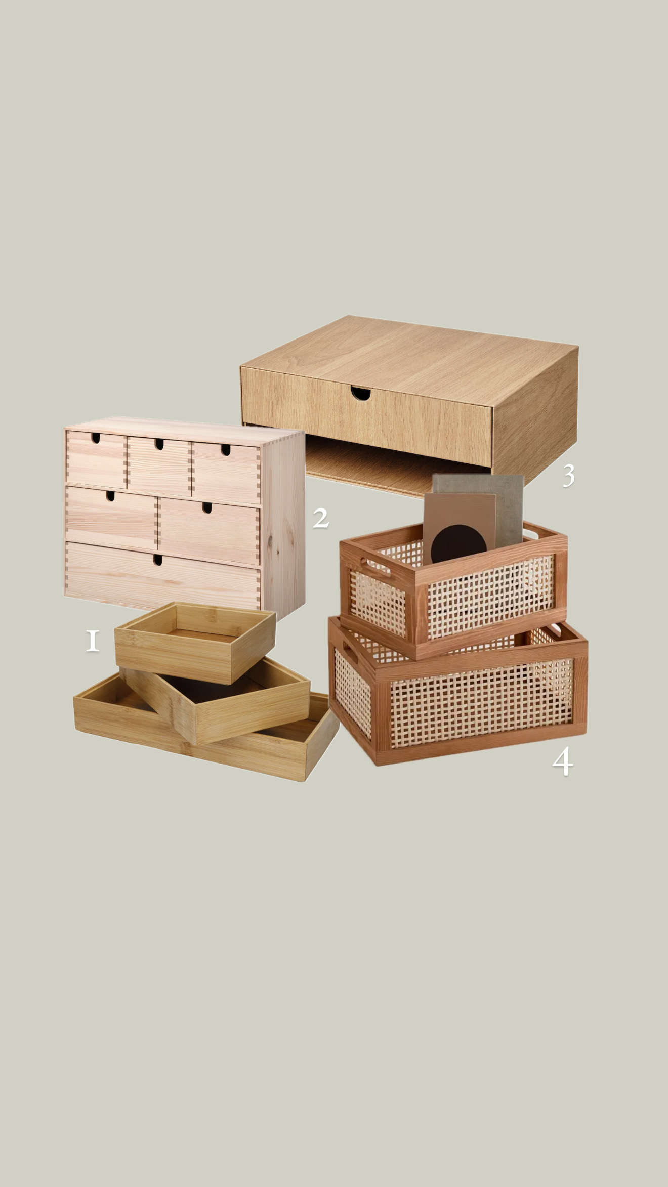 - 1. Drvene kutije za pohranjivanje – Bonami 2. Mini drvena komoda s ladicama – Ikea 3. Mini komoda s organizatorom – Ikea 4. Drvena kutija s ratanom – Temu